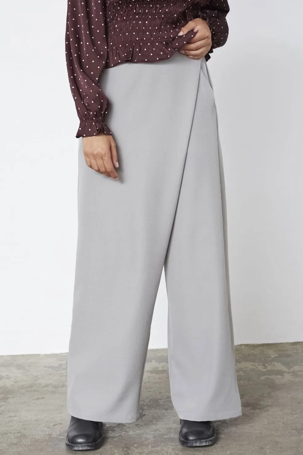 Lysegrå bukser fra Sisters Point med ankel-længde og høj talje. Bukserne har et overlappende design foran og brede ben med lommer.