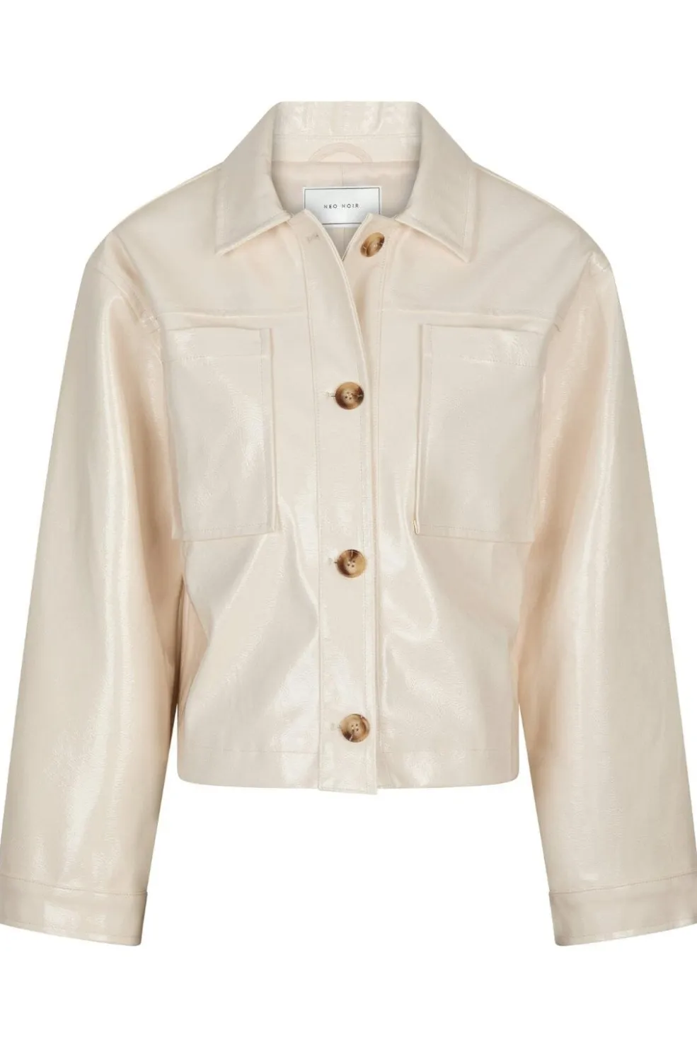 Patentjakke fra Neo Noir i creme med skinnende overflade. Den korte, boxy jakke har en skjortekrave og store frontlommer med dekorative knapper i lys farve.