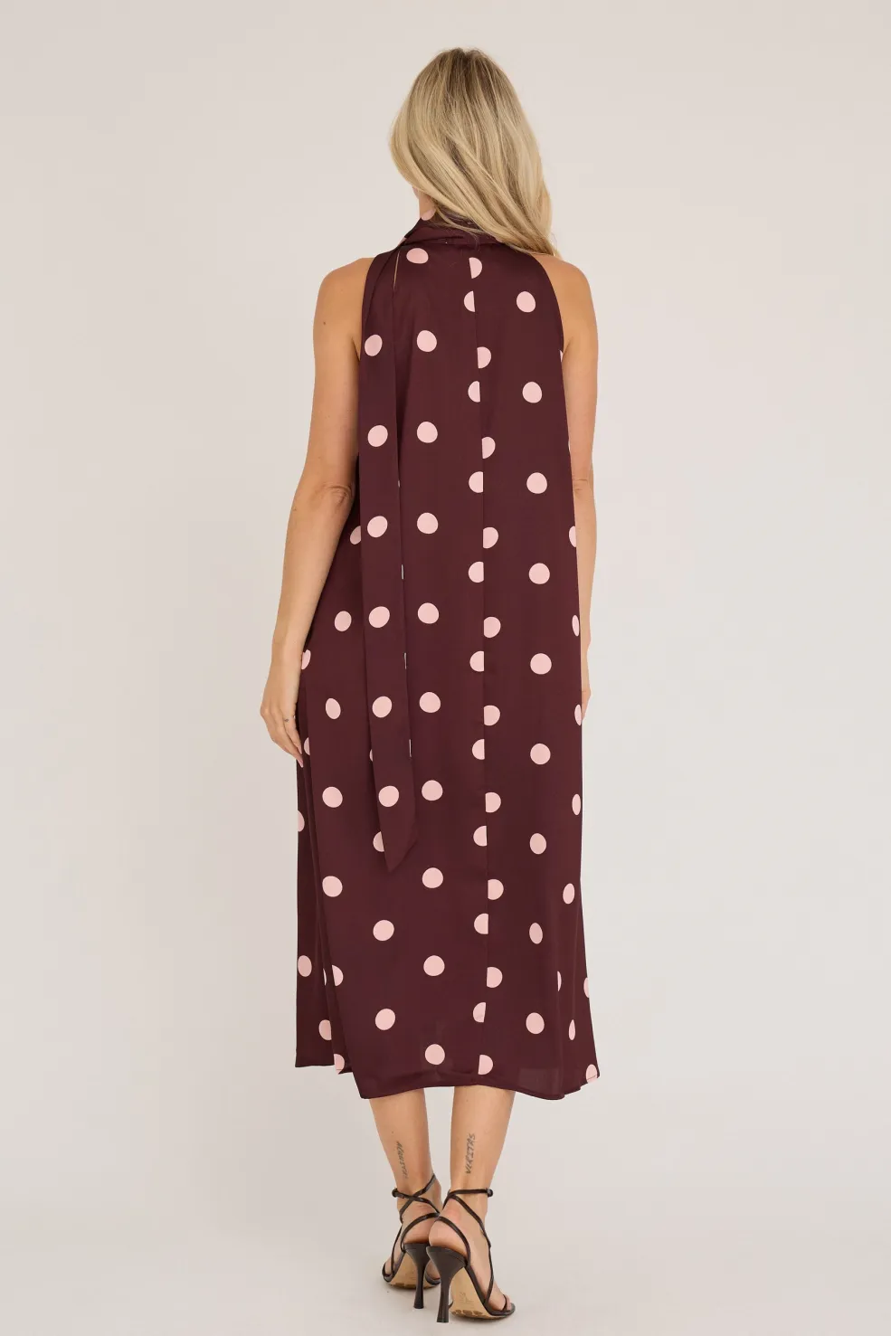 Ærmeløs kjole fra A-View i bordeaux med lyserøde prikker. Kjolen har en løs pasform og går til midt på læggen med bindebånd ved halsen.