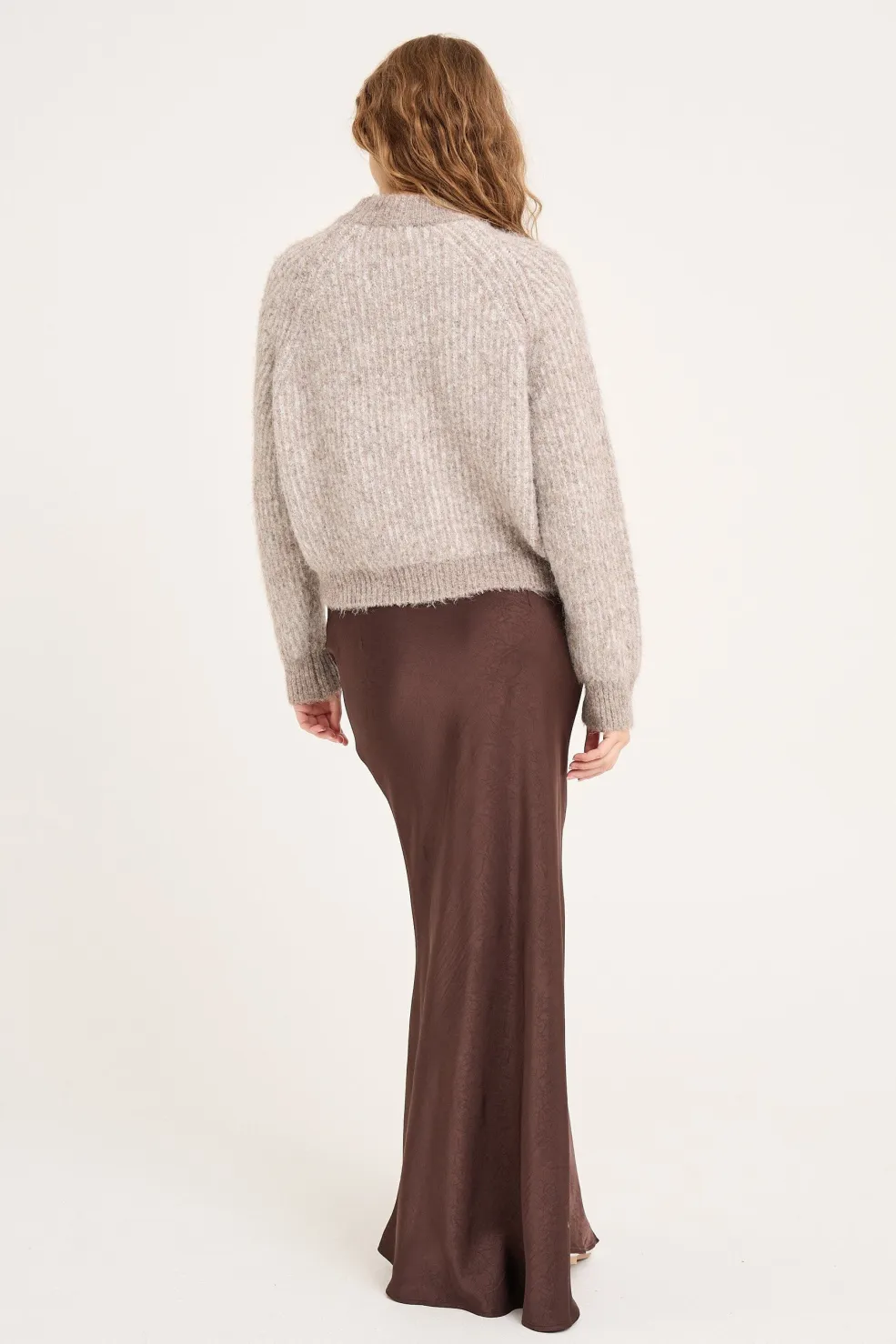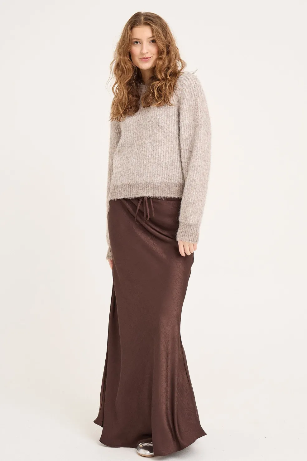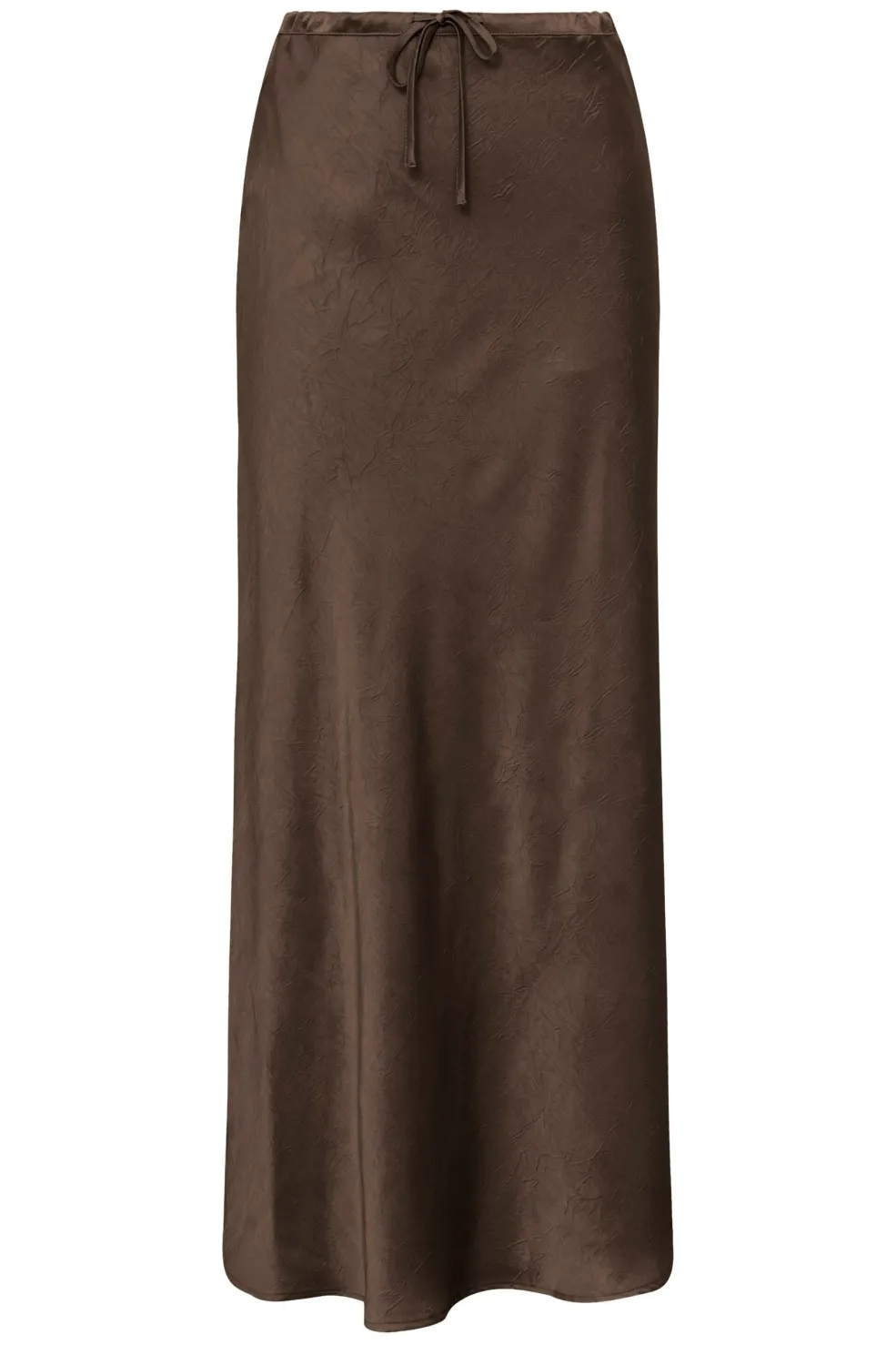 Mørkebrun nederdel fra A-View i satinlook-materiale. En gulvlang model med let vidde i bunden og snørelukning i taljen.