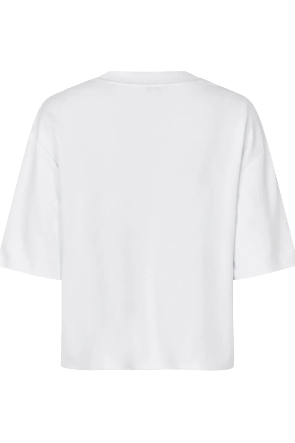 Hvid cropped t-shirt fra MbyM med rund halsudskæring. T-shirten har et kort design, der passer godt sammen med højtaljede bukser.
