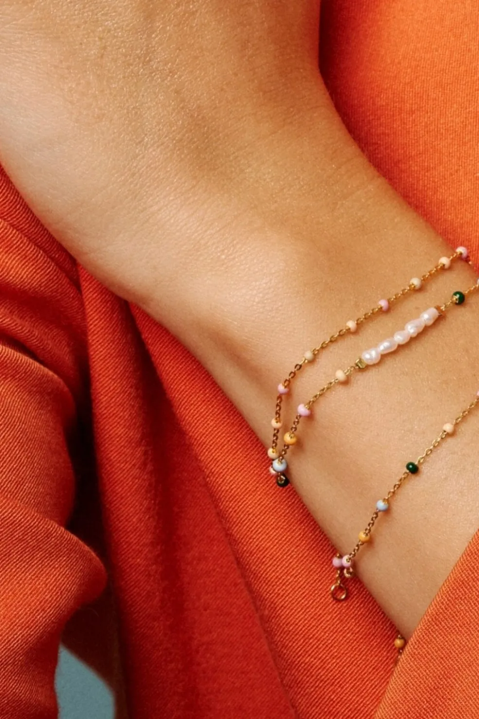 Armbånd fra Enamel Copenhagen med gylden kæde og små perler i lyserød, beige og hvid. Kæden har en karabinlås og emaljedetaljer i bløde farver.
