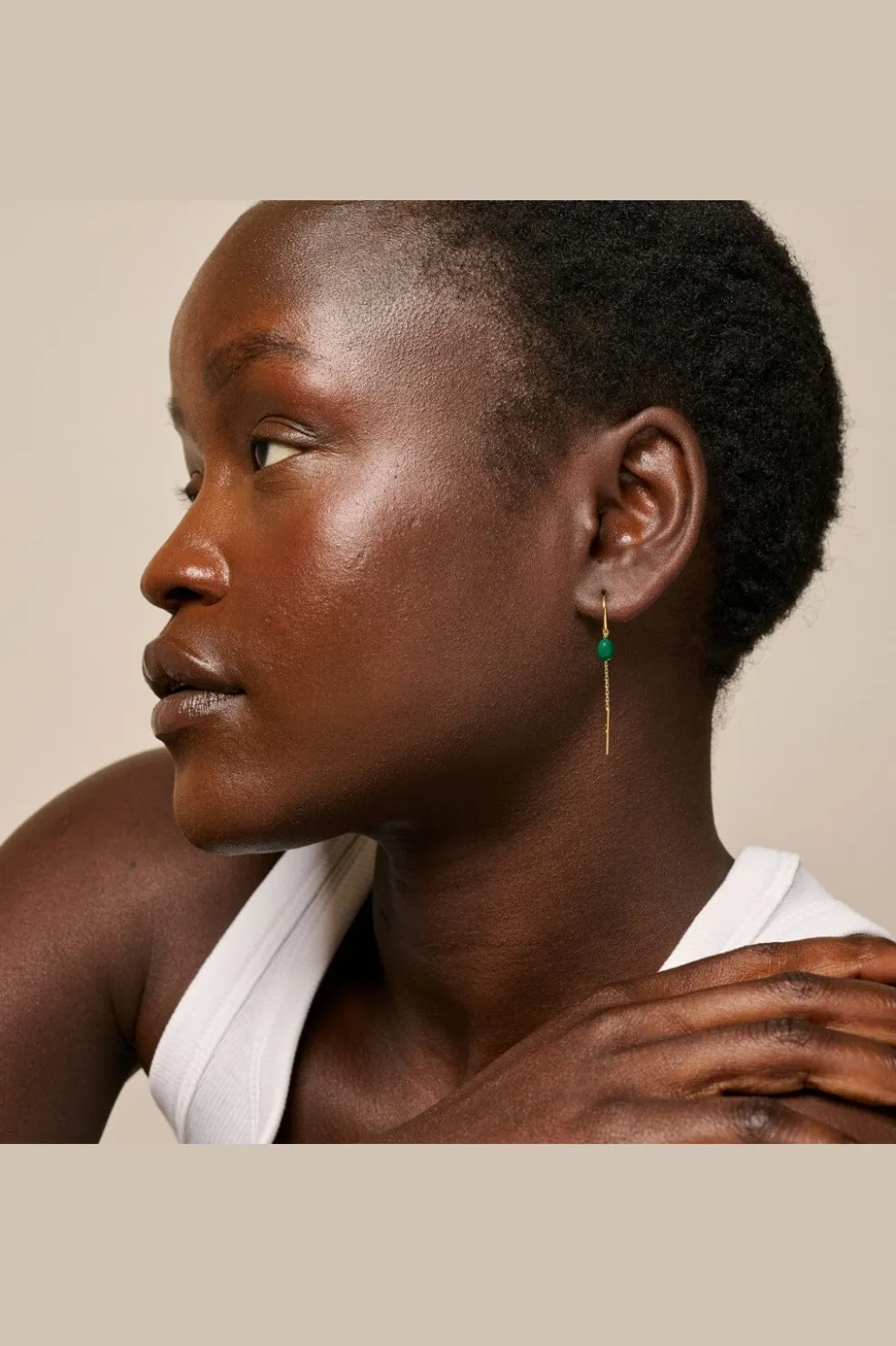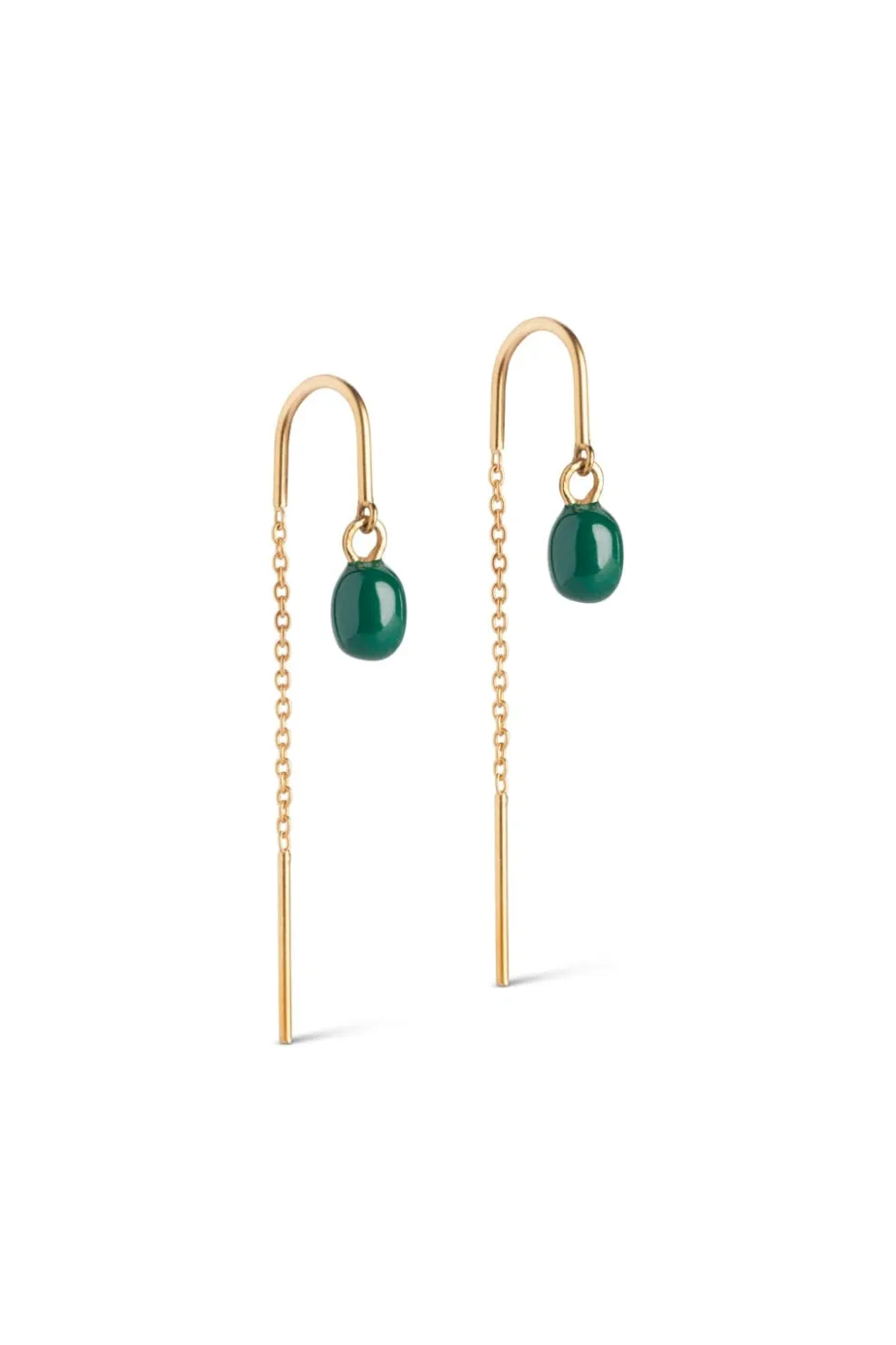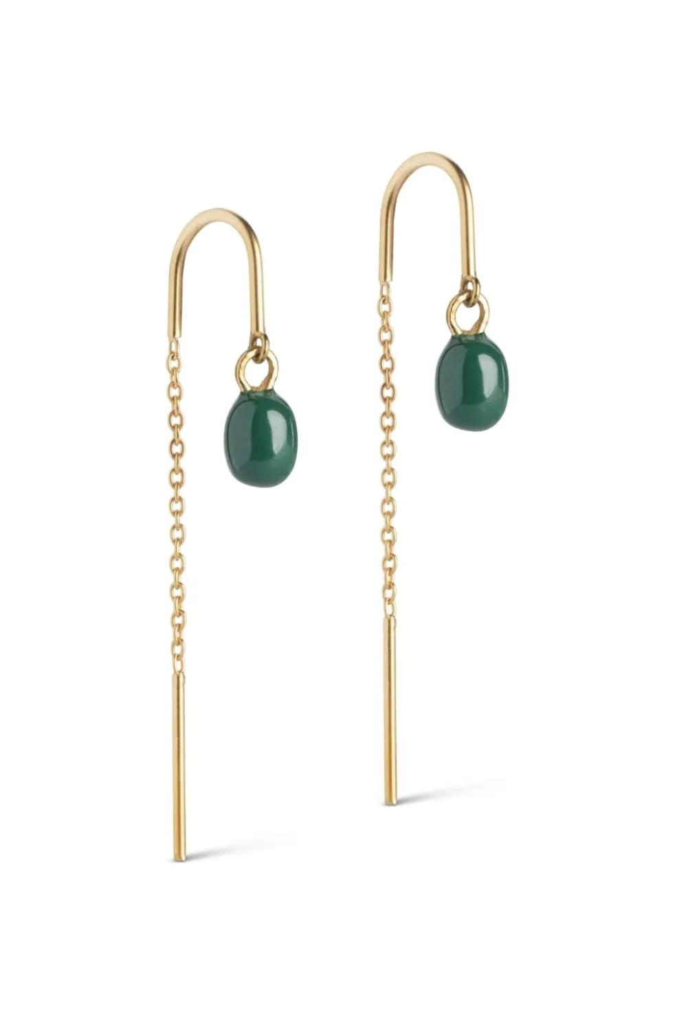 Øreringe fra Enamel Copenhagen med en tynd gylden kæde og en oval perle i petrolgrøn. Den buede krog og det enkle design gør øreringene lette at bære.