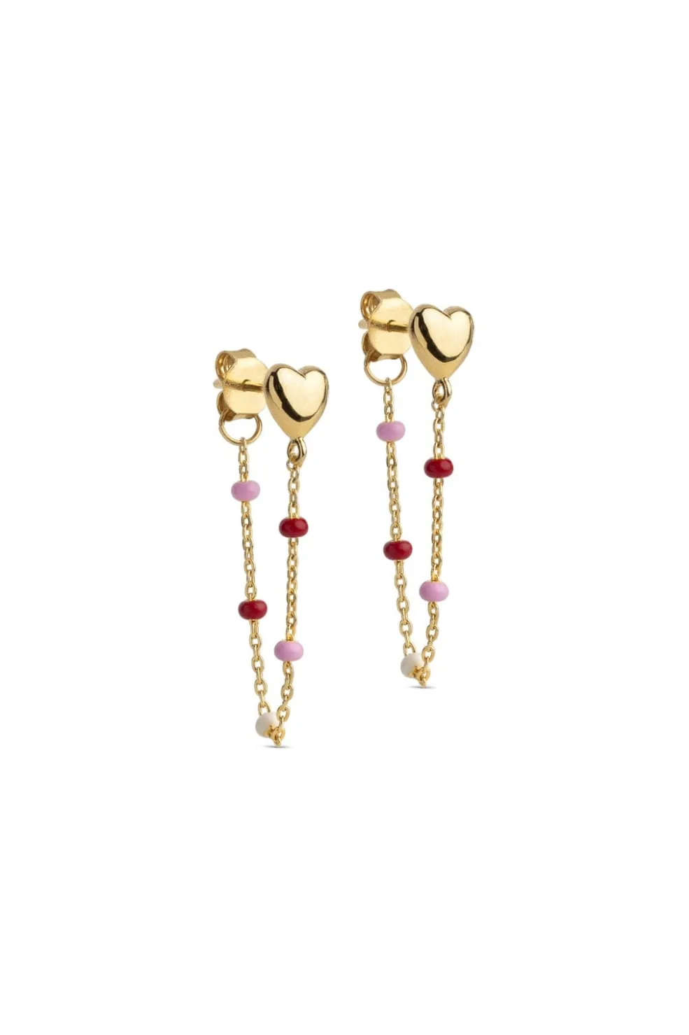 Øreringe fra Enamel Copenhagen med hjerteformet stik i guldbelagt sølv. En kæde med røde, pink og hvide perler hænger under hjertet.