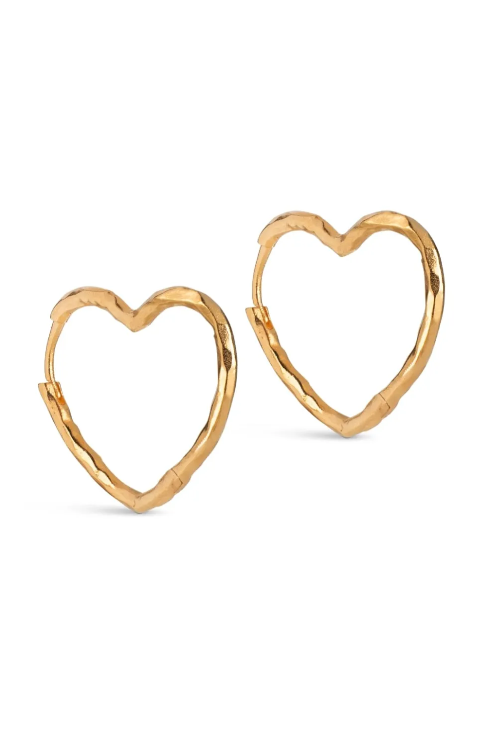 Hjerteformede øreringe fra Enamel Copenhagen. Håndlavede hoops i guldbelagt genbrugssterlingsølv med en struktureret overflade og organisk form.