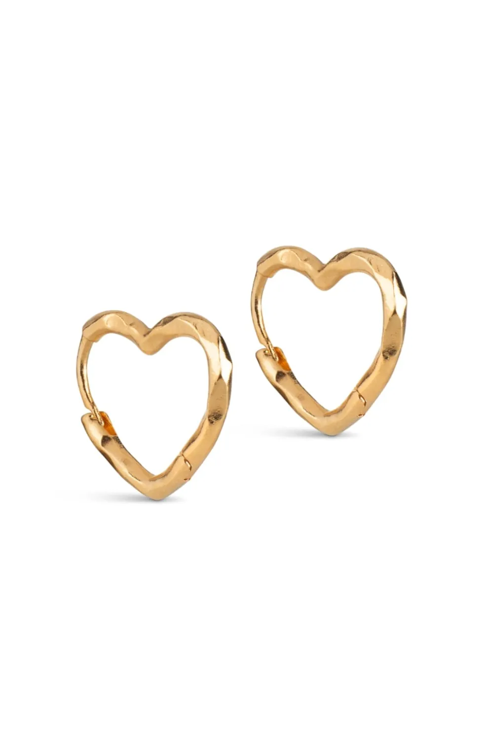 Håndlavede hjerteformede øreringe fra Enamel Copenhagen. De små hoops er fremstillet i genbrugssterling sølv med guldbelægning og har en organisk form.