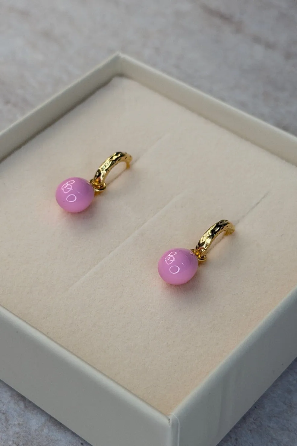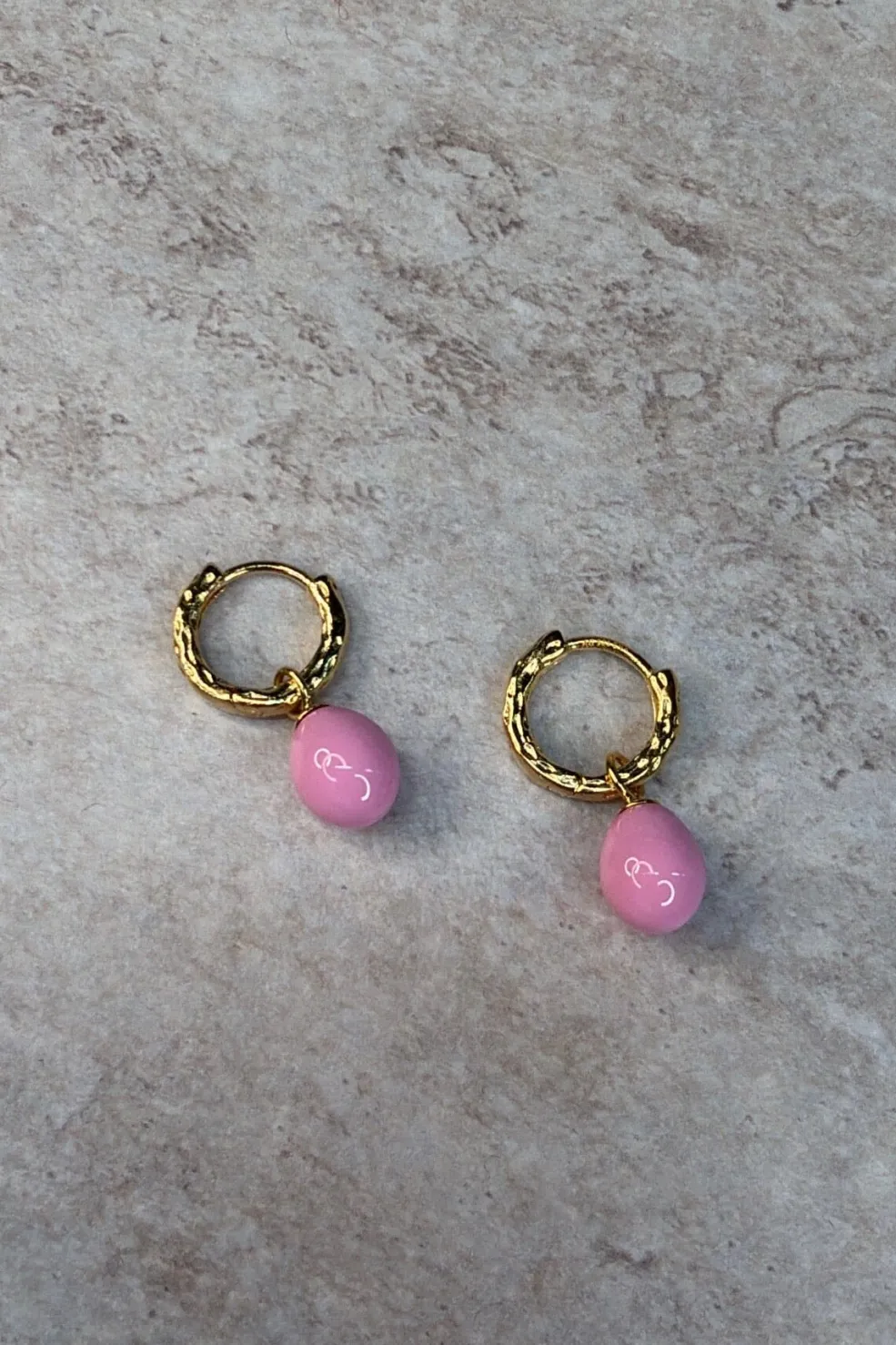 Gyldne hoops fra Enamel Copenhagen med en hamret overflade. De små øreringe har et lyserødt, ovalt emaljevedhæng, der er fastgjort med en lille ring.