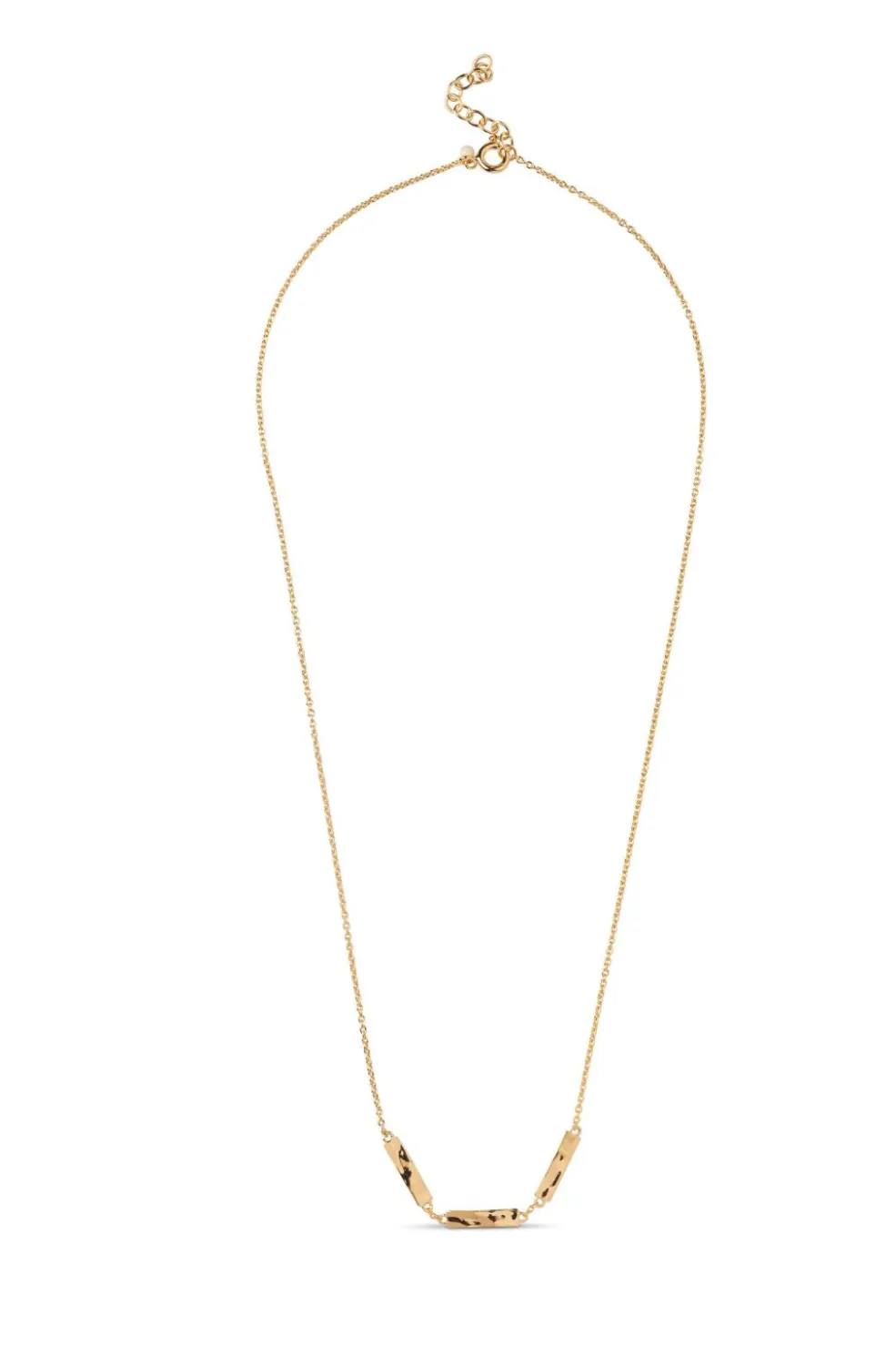 Et gyldent halskæde fra Enamel Copenhagen med et geometrisk vedhæng. Kæden er tynd, og vedhænget har en plettet overflade med forbundne elementer.