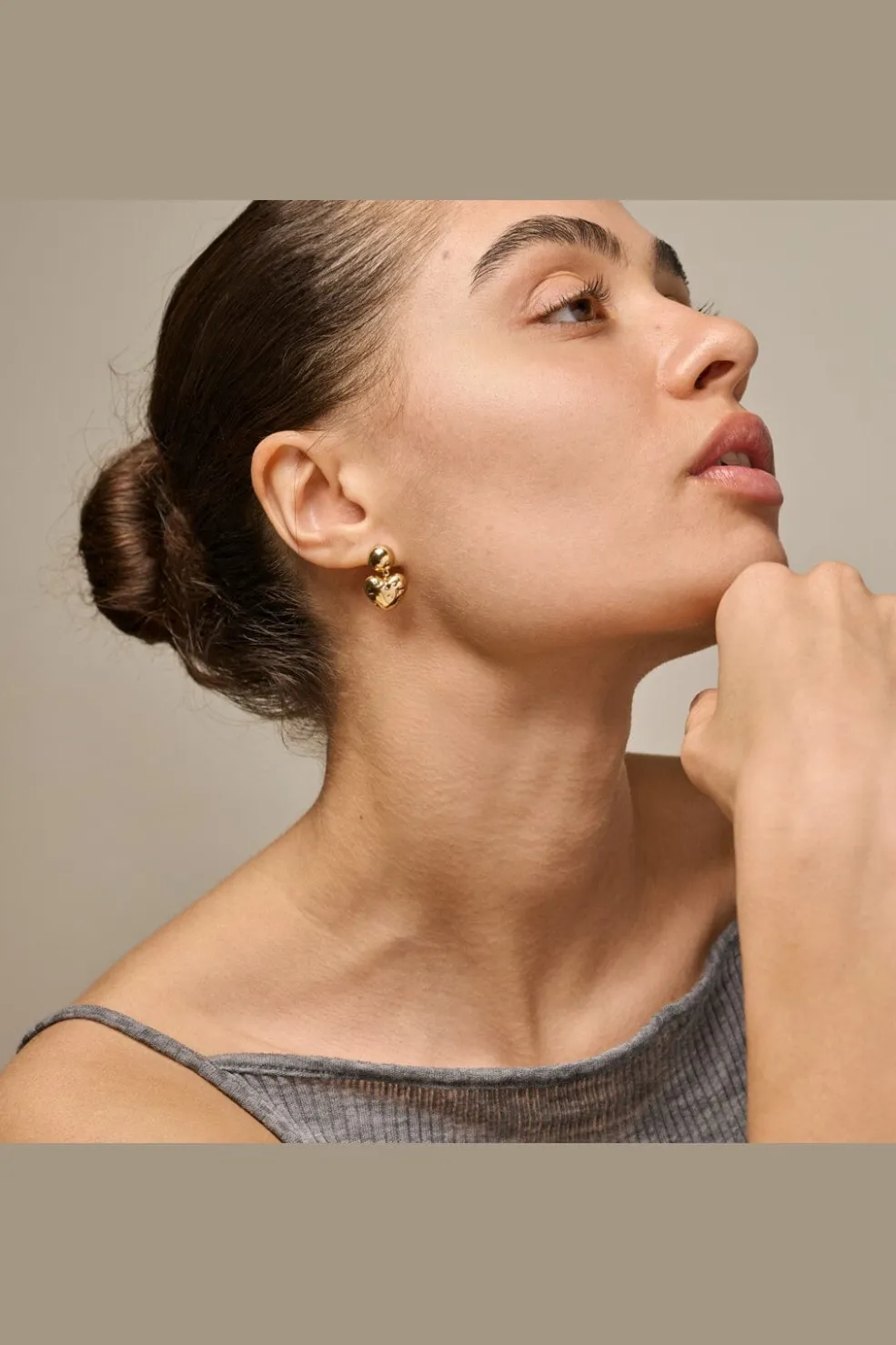 Øreringe fra Enamel Copenhagen med rund stud og hængende hjerte. Den skinnende overflade har en varm, gylden tone, og hjertet er udformet i en organisk form.