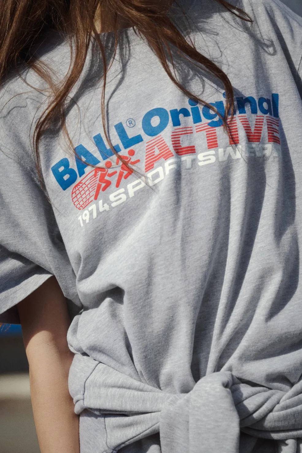 Grå melange t-shirt fra Ball med løs pasform. T-shirten har et grafisk print på forsiden i blå og rød med teksten BALL® Original ACTIVE samt 1974 SPORTSWEAR i hvid.