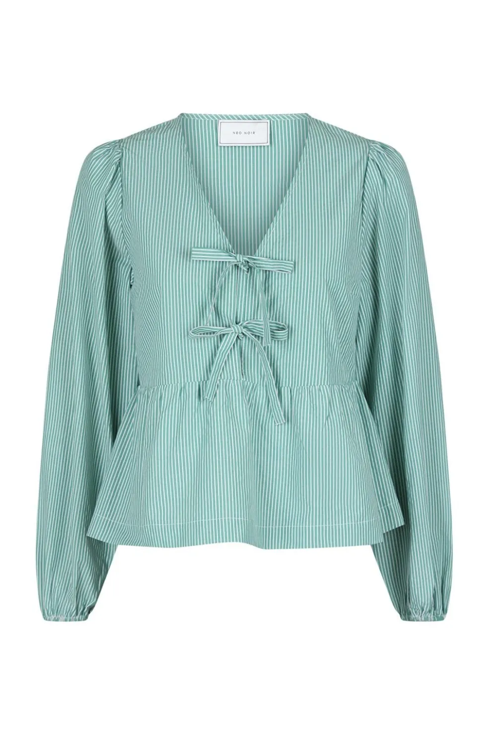 Grøn stribet bluse fra Neo Noir med peplum-design og flæser. Blusen har en v-halsudskæring og sløjfedetaljer, der giver den et personligt præg.