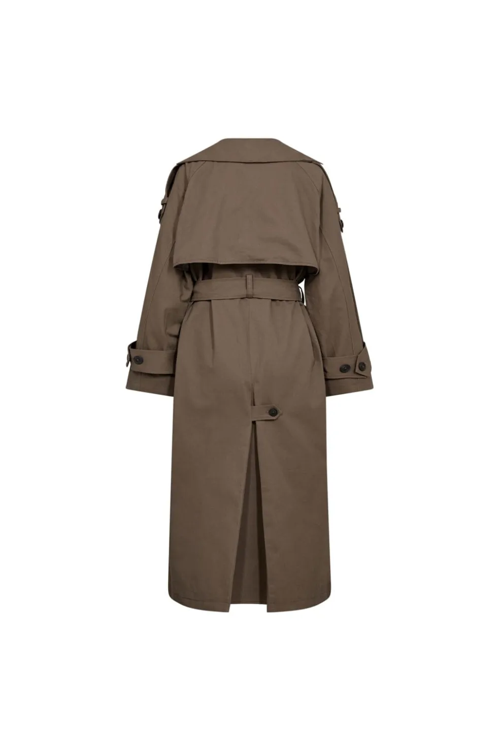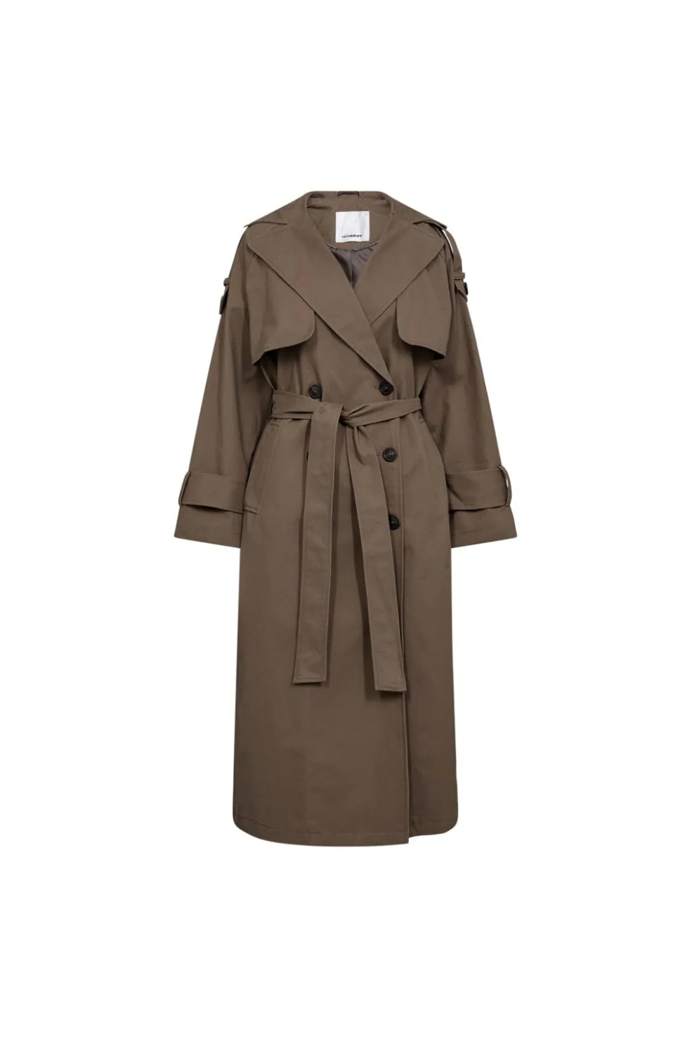 Trenchcoat fra Co’Couture i en brun nuance. Den har et klassisk design med bælte i taljen og dobbeltknaplukning.