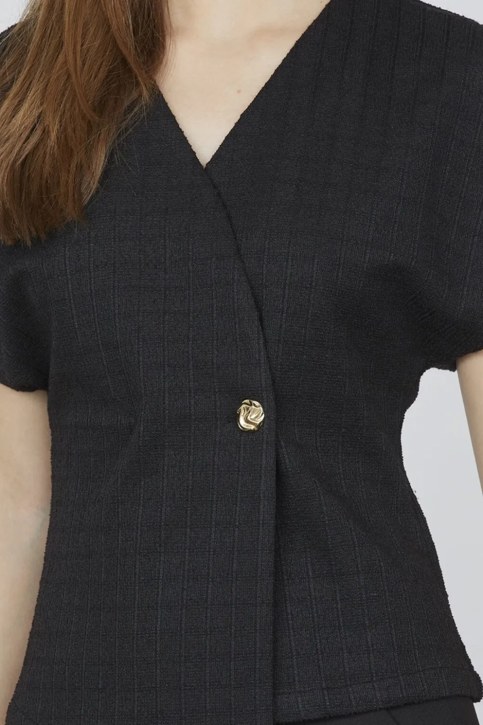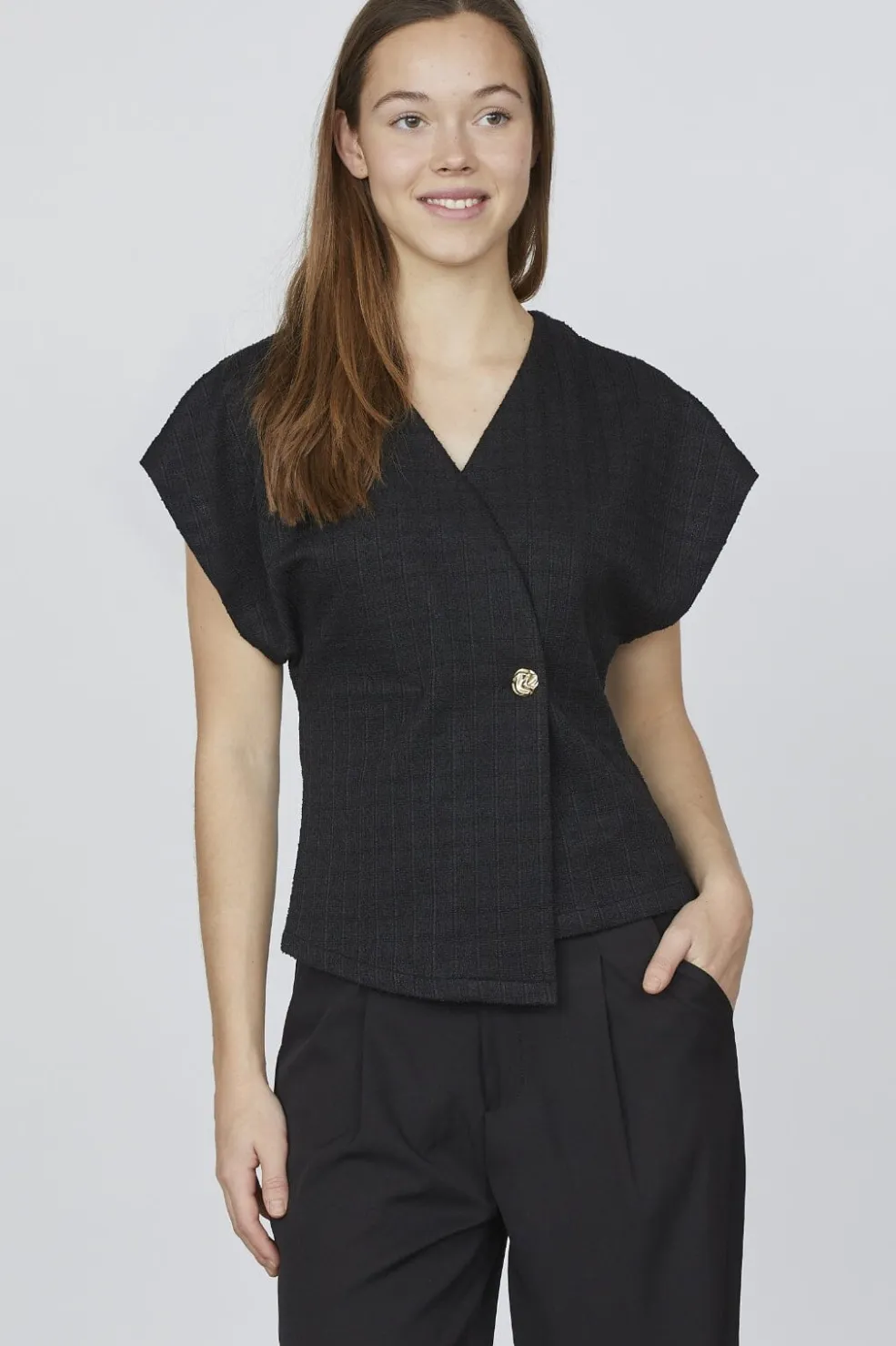 Sort vest fra Sisters Point med asymmetrisk slå-om-design. Den har korte kimonoærmer og en V-halsudskæring, der giver vesten et let udtryk. En guldknap ved taljen samler designet.