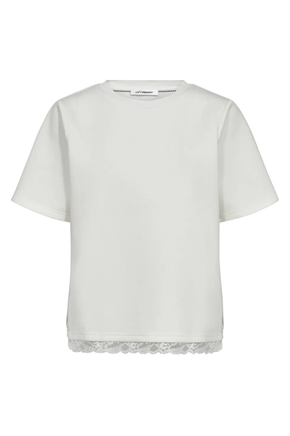 Hvid t-shirt fra Co´Couture med blondekant forneden. T-shirten har en rund halsudskæring og korte ærmer. Den passer til både hverdagen og festlige lejligheder.