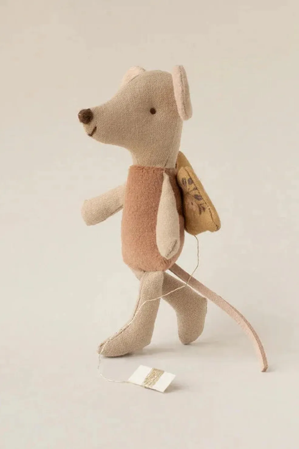 En fe-mus fra Maileg med bløde vinger i beige og brune nuancer. Musen har en lang hale og en brun overdel med beige arme og ben.