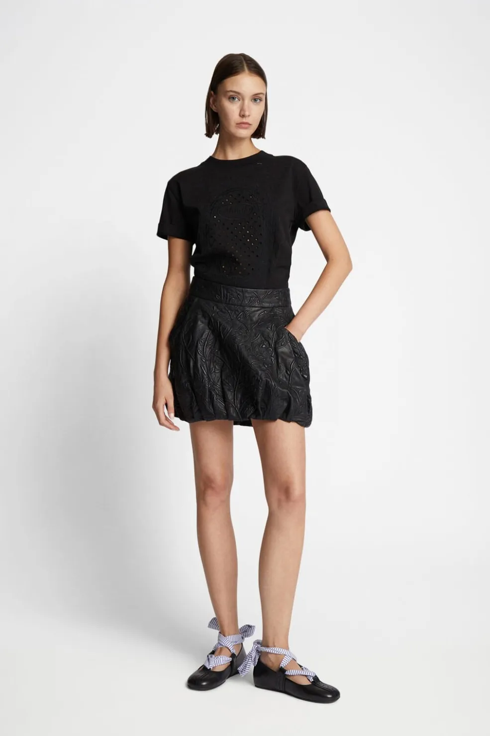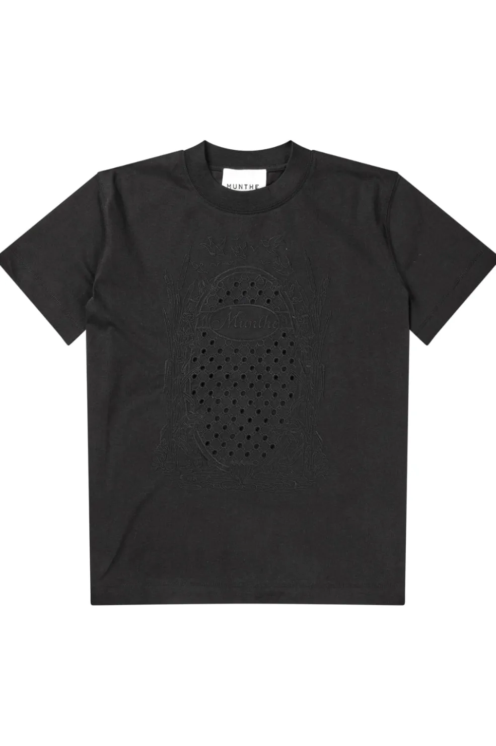 Sort t-shirt med hulmønster og broderi fra Munthe. T-shirten har en rund halsudskæring og korte ærmer.