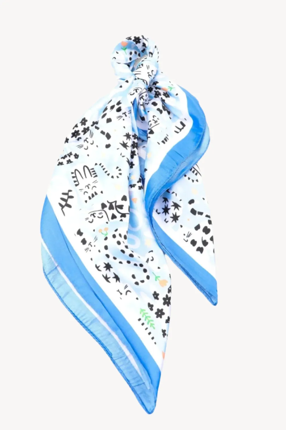 Tørklæde fra A-bee med et sort mønster af dyr og blomster på hvid bund. Den blå kant langs kanten skaber en fin kontrast til det legende design.