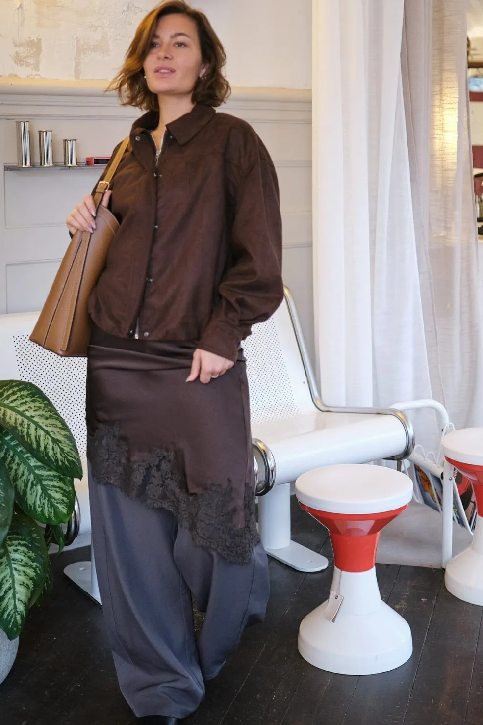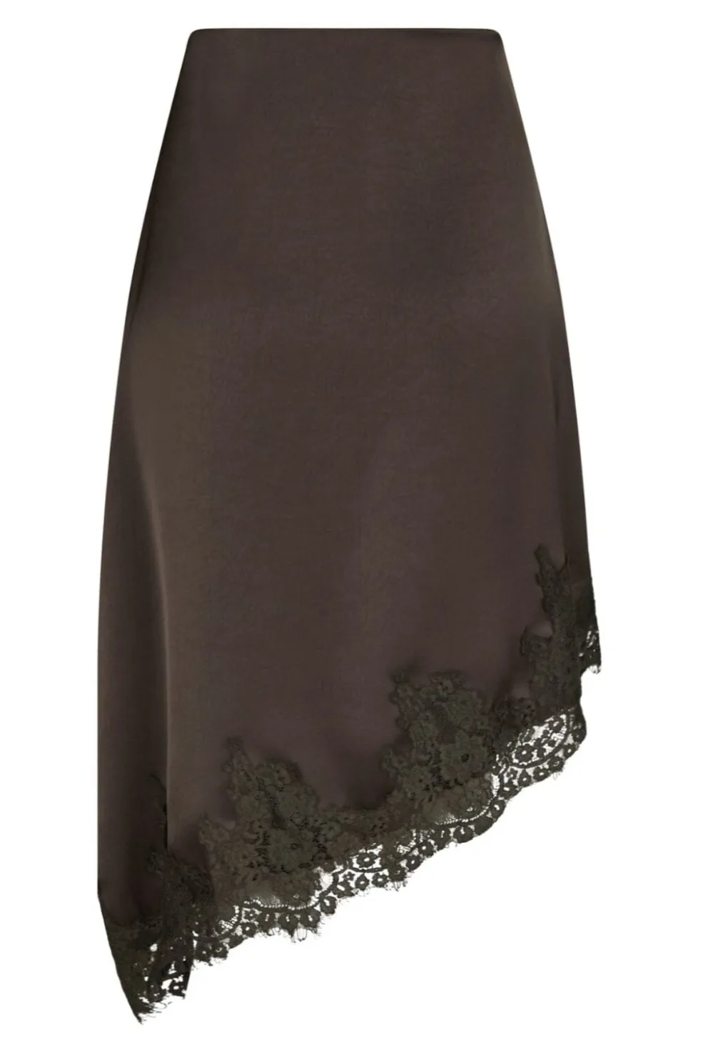Mørkebrun nederdel fra Neo Noir med blondekanter og et asymmetrisk snit. Nederdelen er lavet i en satinlignende kvalitet.