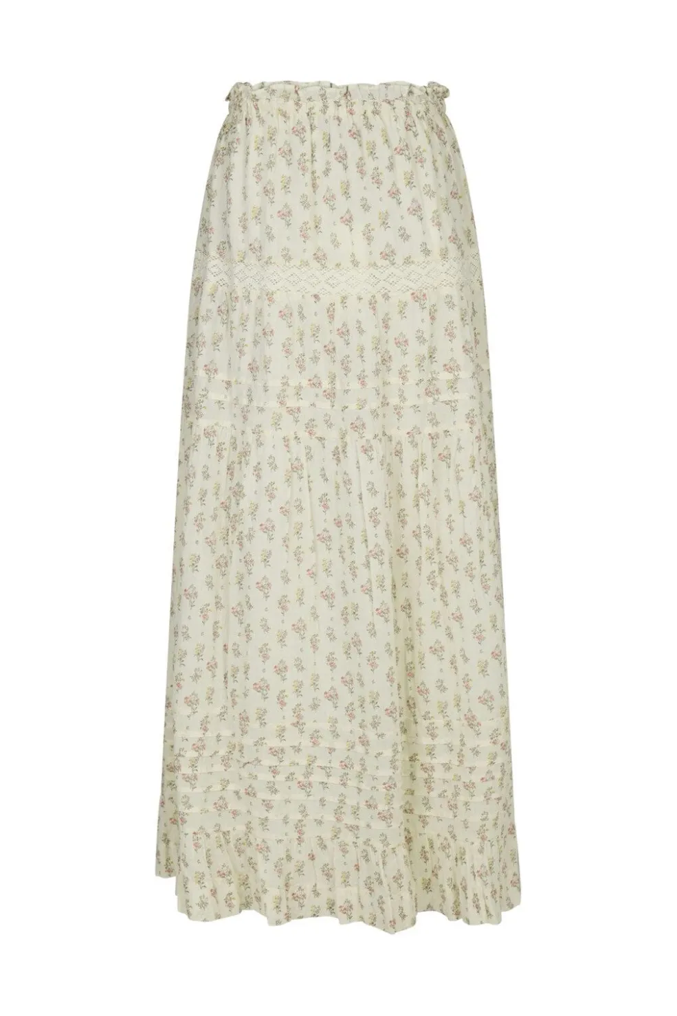 Lang nederdel fra Neo Noir i creme med små lyserøde blomster. Nederdelen har flæser og læg, der skaber bevægelse i stoffet, samt en elastisk talje med bindebånd.