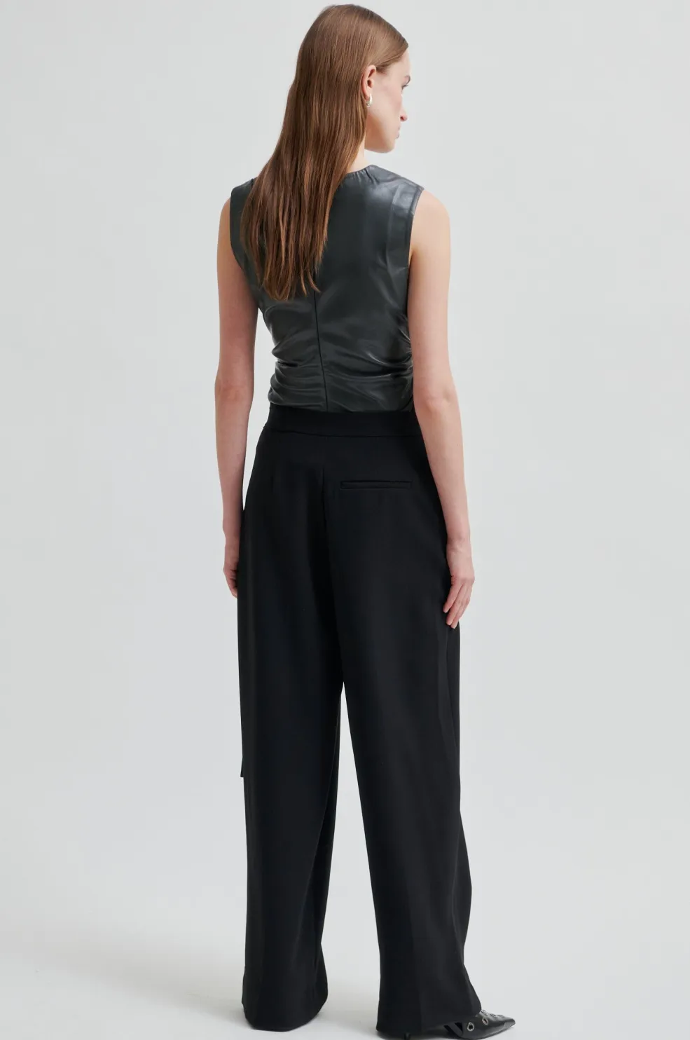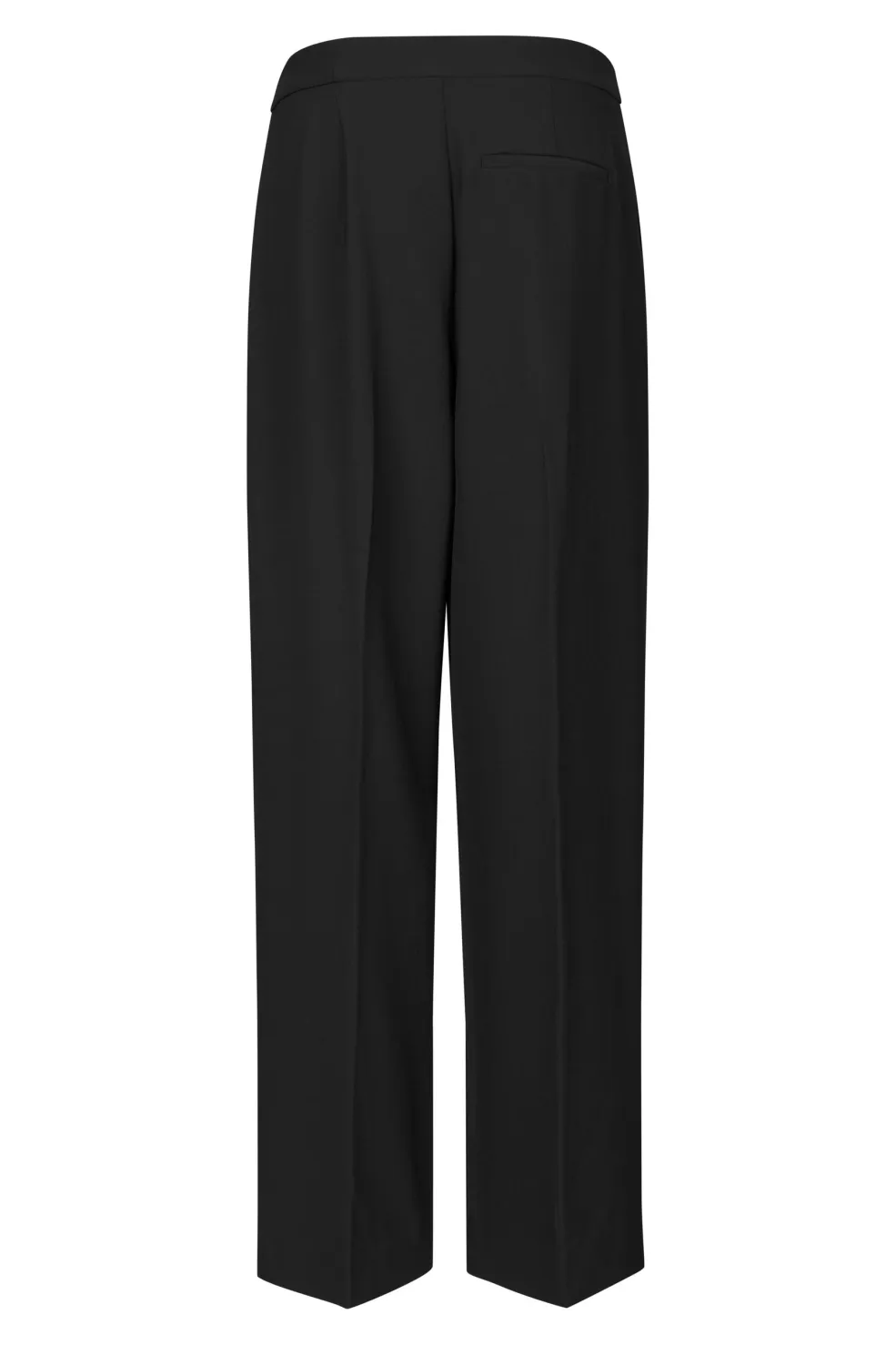 Sorte wrap-bukser fra Second Female, lavet af en polyesterblanding med elastan. Bukserne har en diagonal slå-om-detalje med spændelukning i den ene side.