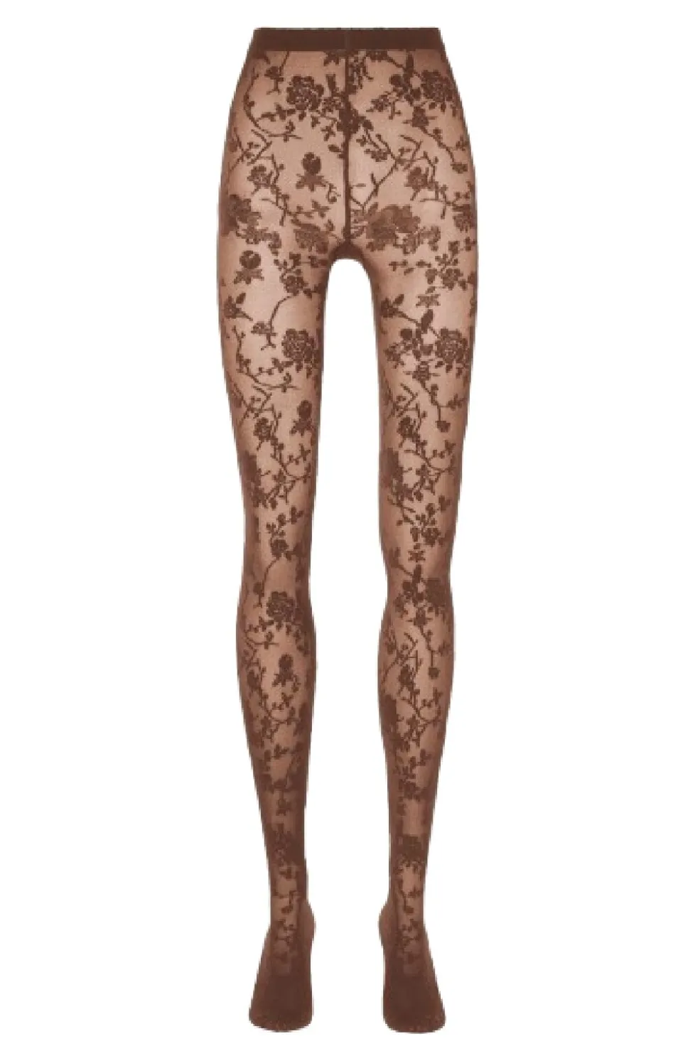 Strømpebukser fra Wolford i en brun almond-nuance. Det broderede blomstermønster dækker strømpebukserne fra ankel til liv og skaber et fint udtryk med dekorative syninger.
