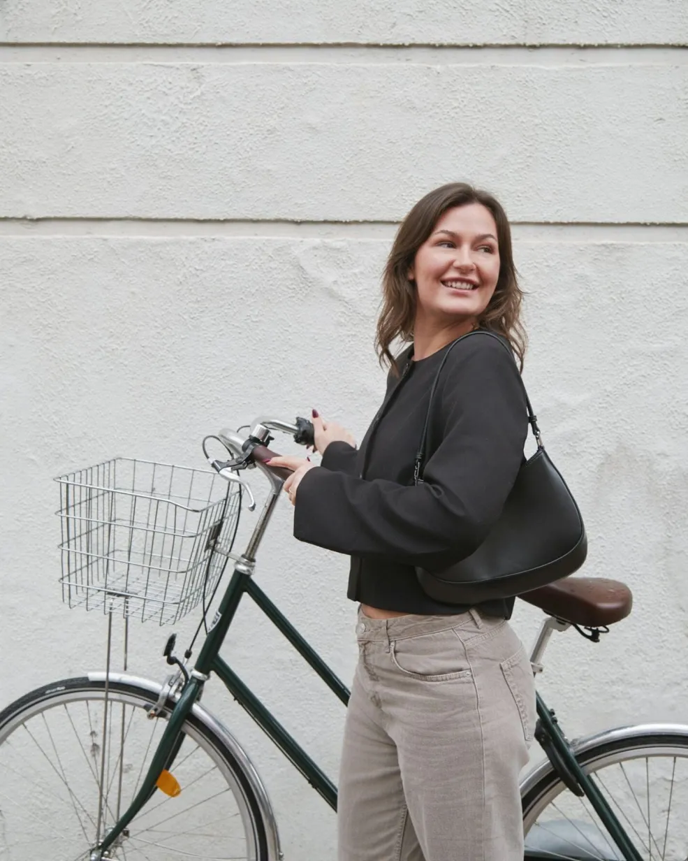 Sort jakke med cropped design. Den har en rund halsudskæring og knaplukning foran. Jakken har en normal pasform og lange ærmer med let udvidelse.