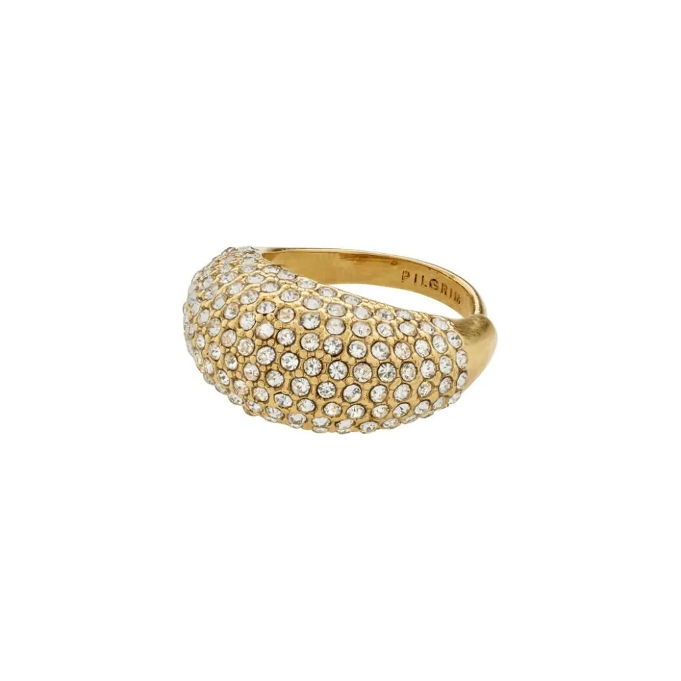 Guldbelagt ring fra Pilgrim FOCUS-kollektionen med Preciosa-krystaller. Ringen har en buet form med krystaller på overfladen, der skaber et funklende udtryk.