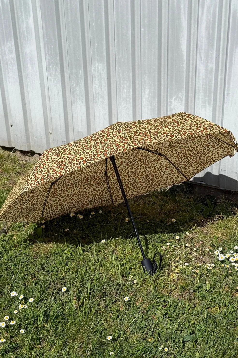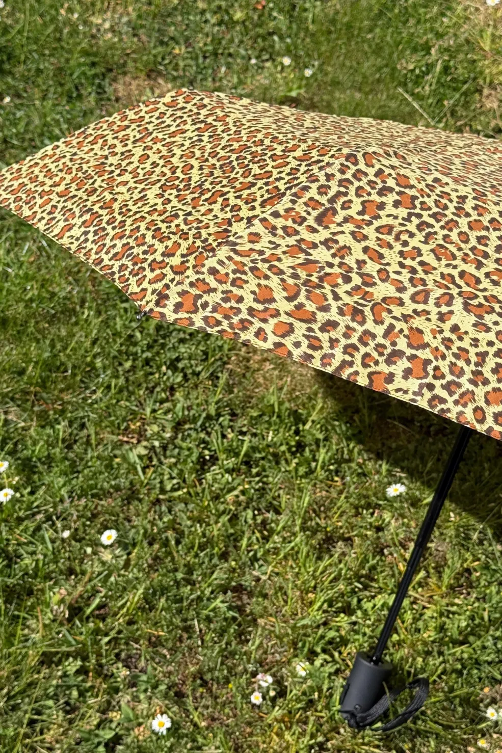 Foldbar paraply fra Mellow Moon med leopardmønster i brune og gule nuancer. Den kompakte konstruktion gør den nem at have med i tasken.