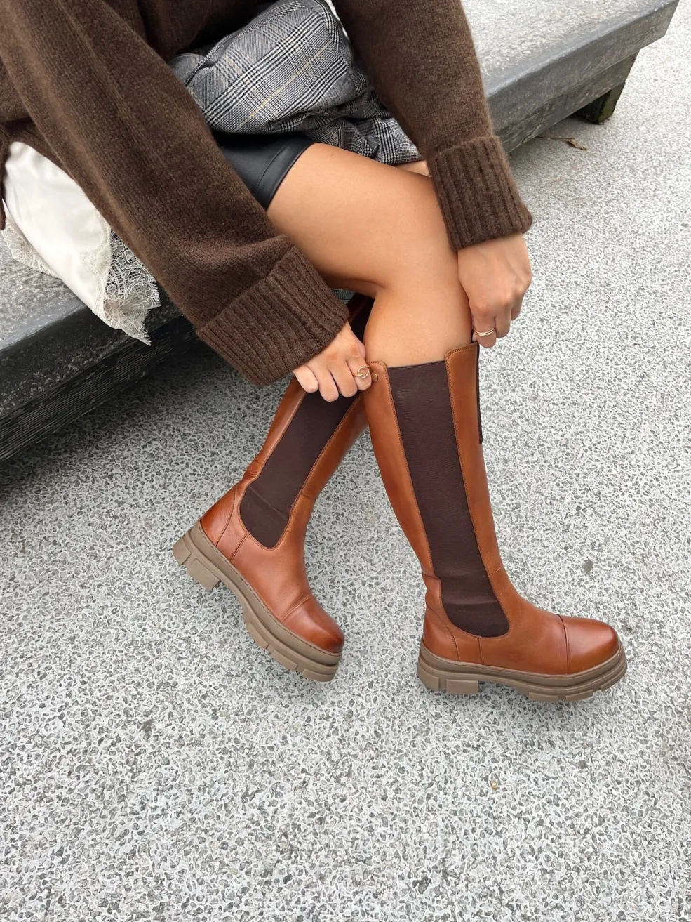 Knæhøje støvler i cognacfarvet læder med mørke elastikpaneler på siderne. TPR-sålen har et chunky design, der giver god støtte til foden.