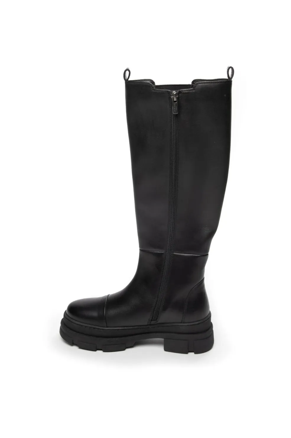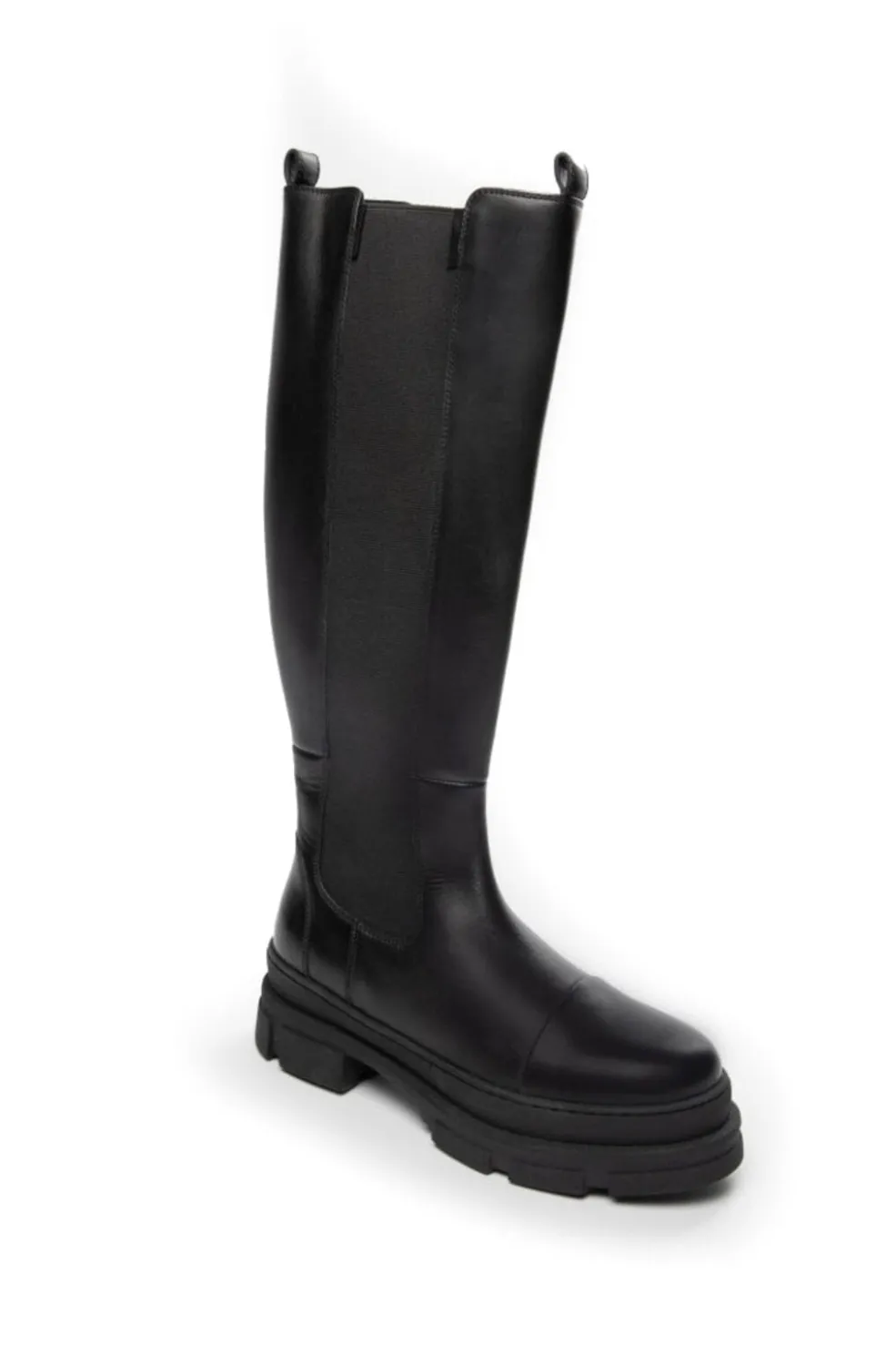 Knæhøje støvler fra Copenhagen Shoes, lavet af sort læder med sorte syninger. Den chunky sål og blokhælen giver støvlerne et markant look.