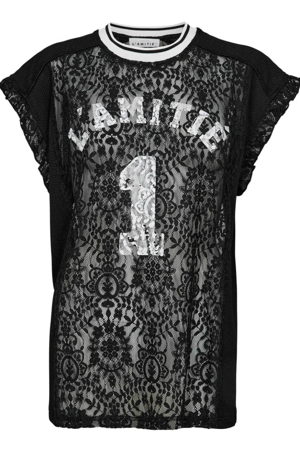 Sort top fra Haute L’Amitié med blonder, print og flæser. Den runde hals har en hvid kant, der giver et sporty præg.
