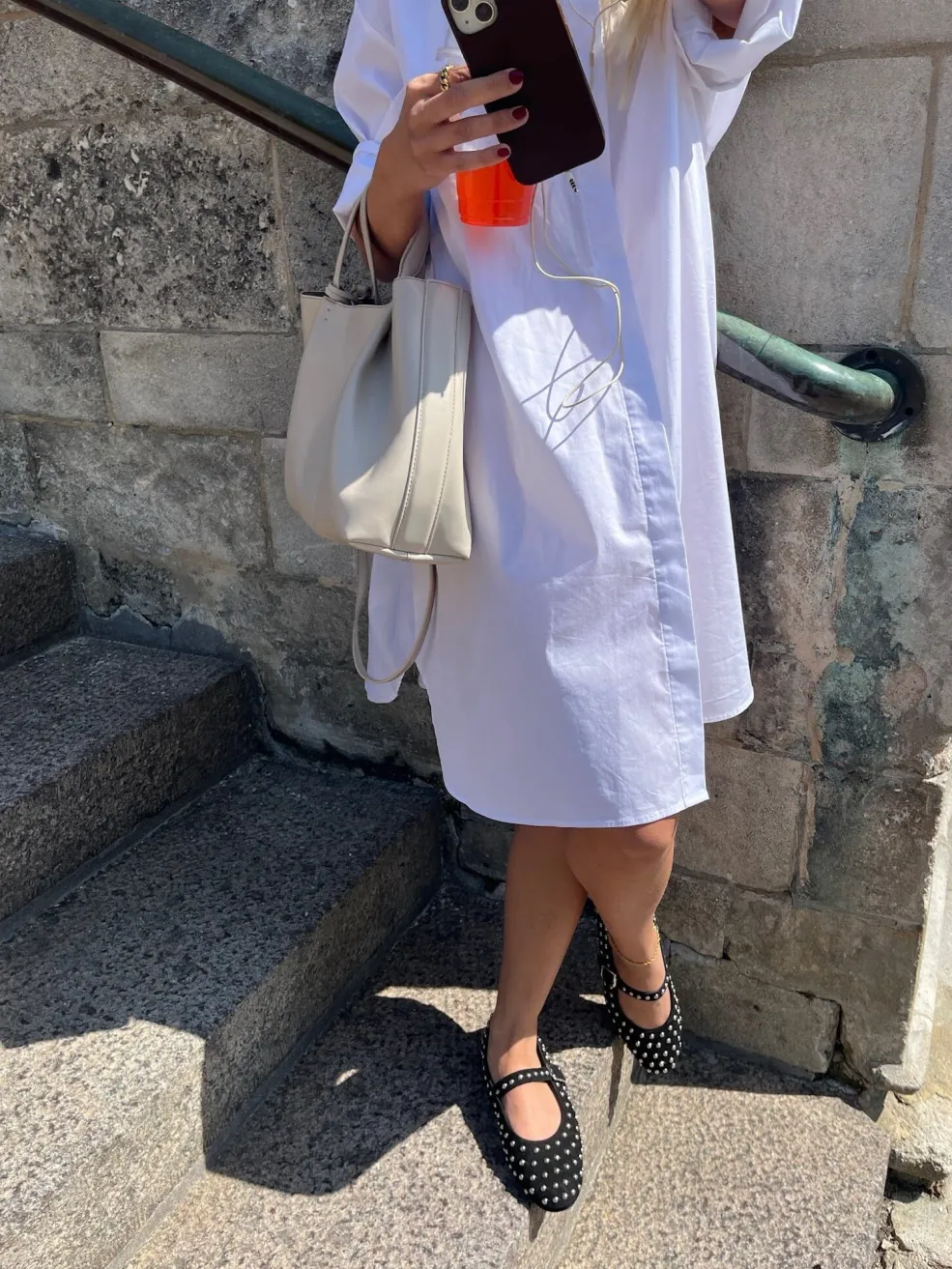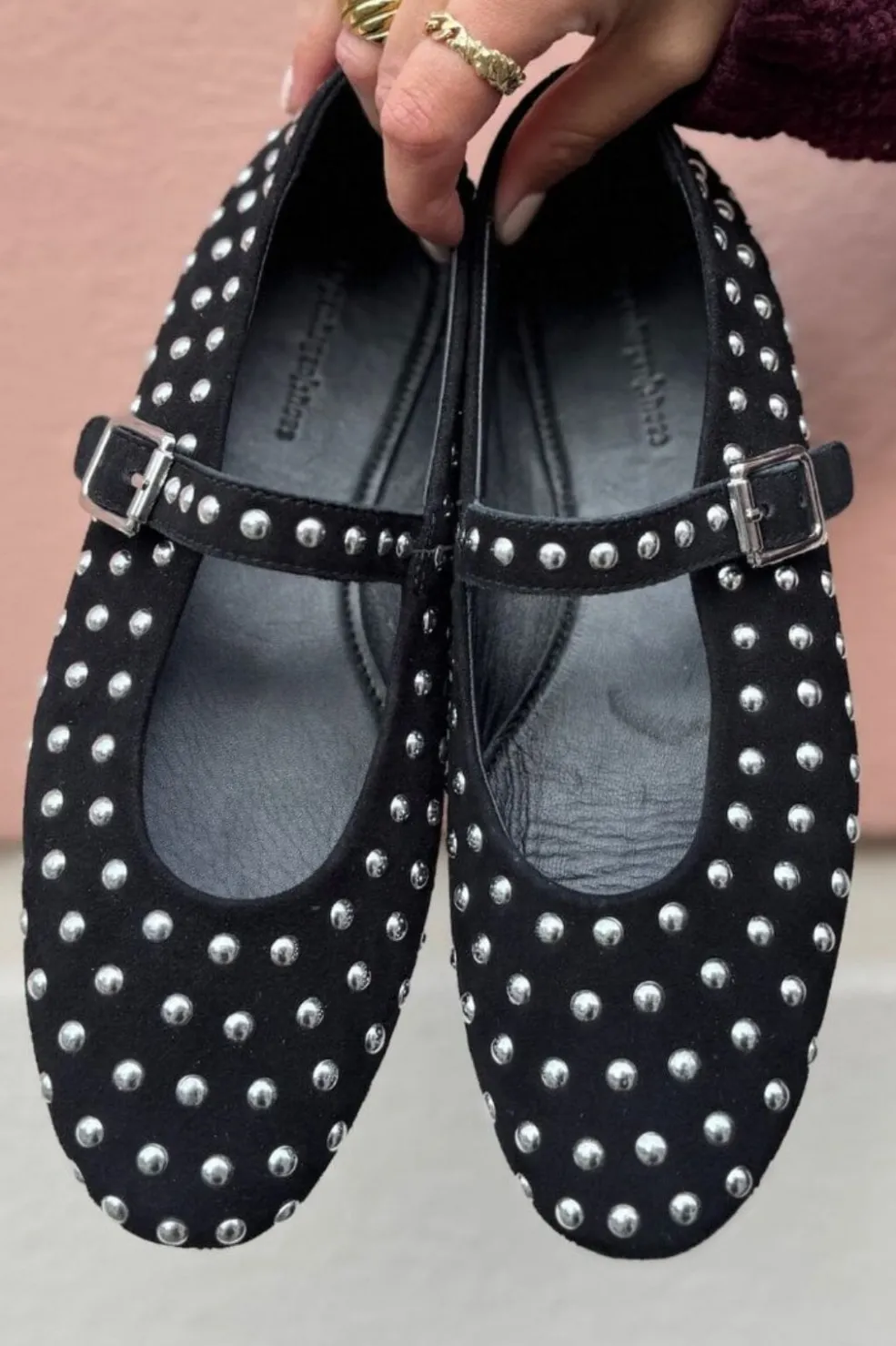 Sorte ballerinaer i ruskind med sølvfarvede nitter. Skoene har en rem over vristen og rund tå. De er designet med en flad sål.