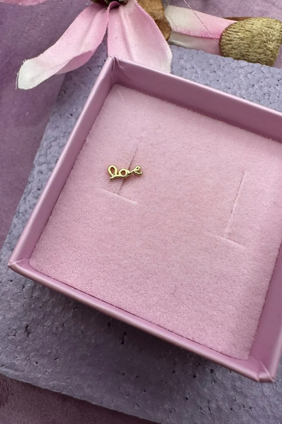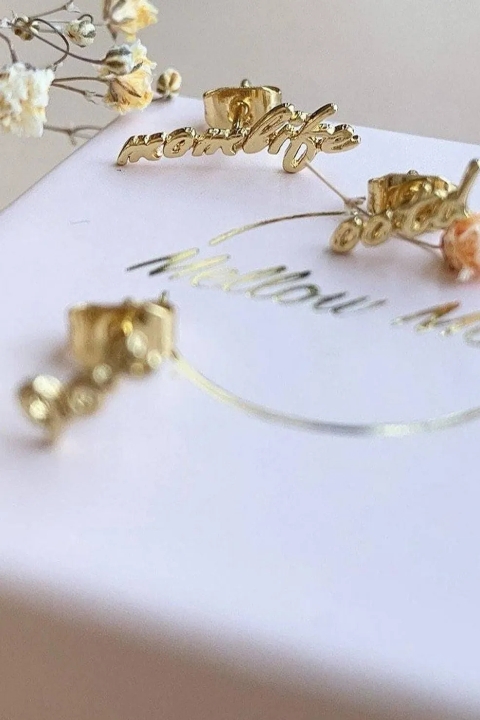 Forgyldt ørering fra Mellow Moon med teksten love. Øreringen har en fin detalje i form af skriften, der er udført i 18 karat forgyldt messing.