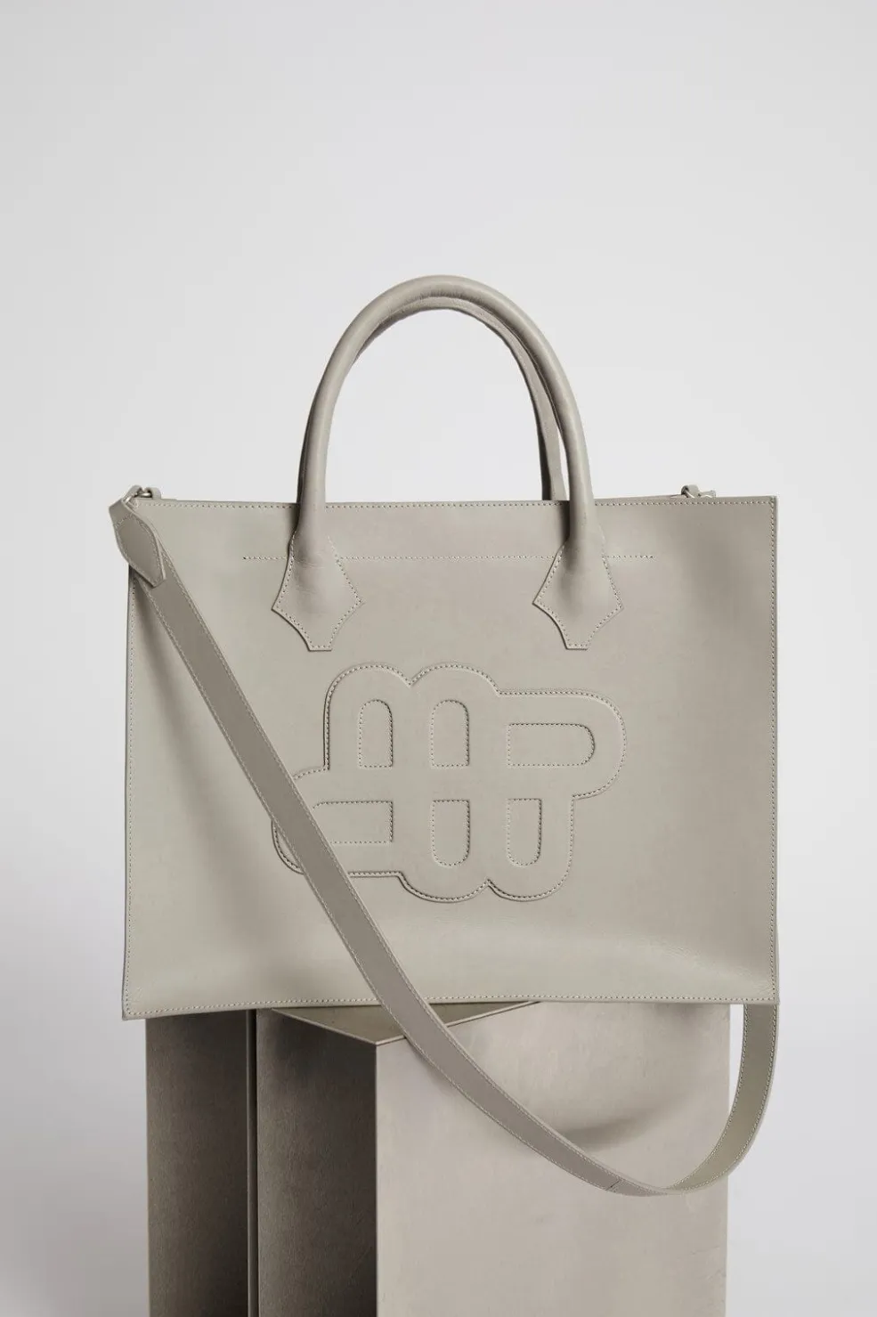 Lys grå håndtaske fra Munthe i læder med et minimalistisk design. Tasken har både korte hanke og en lang skulderrem samt et logo på forsiden.