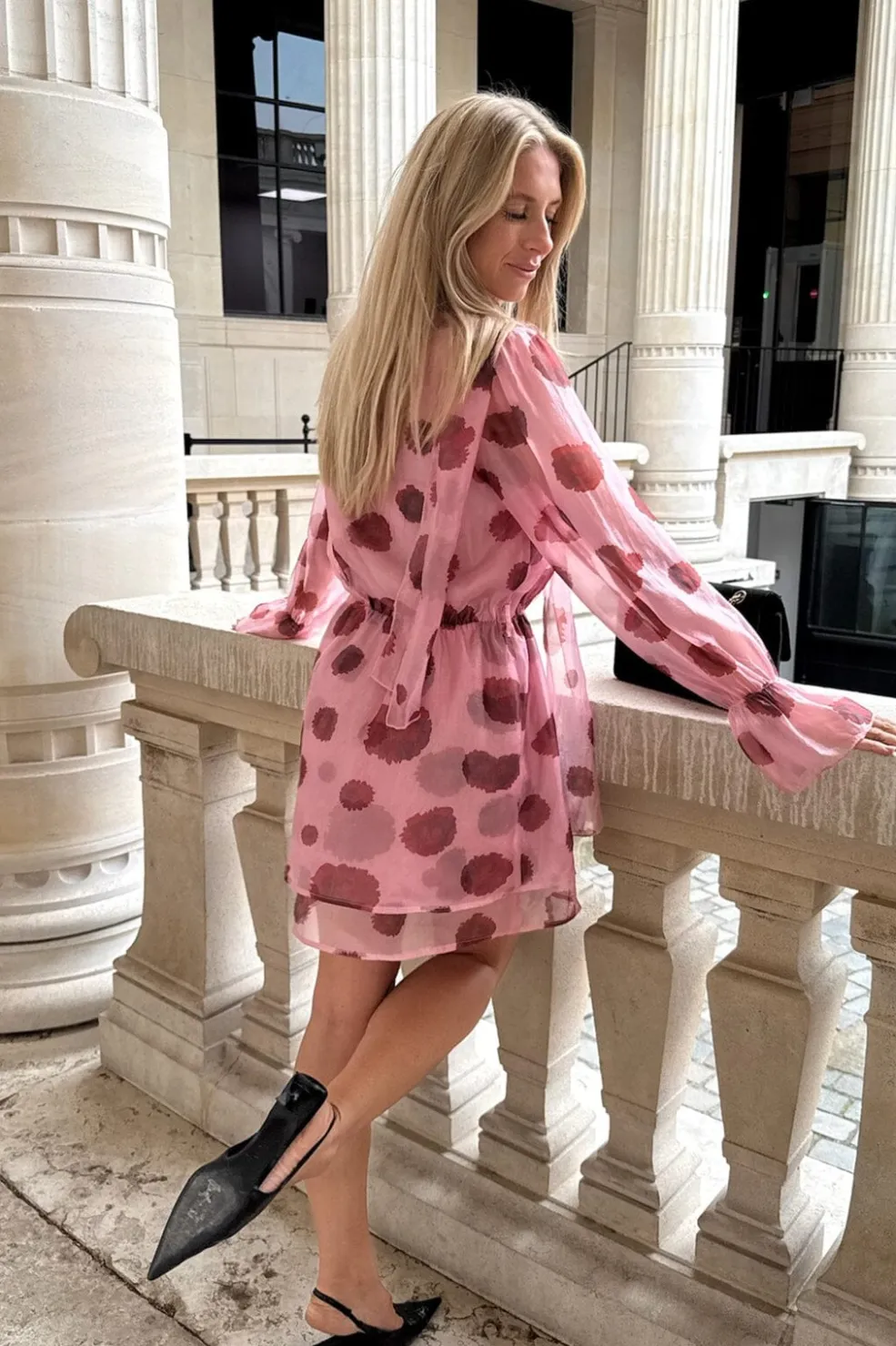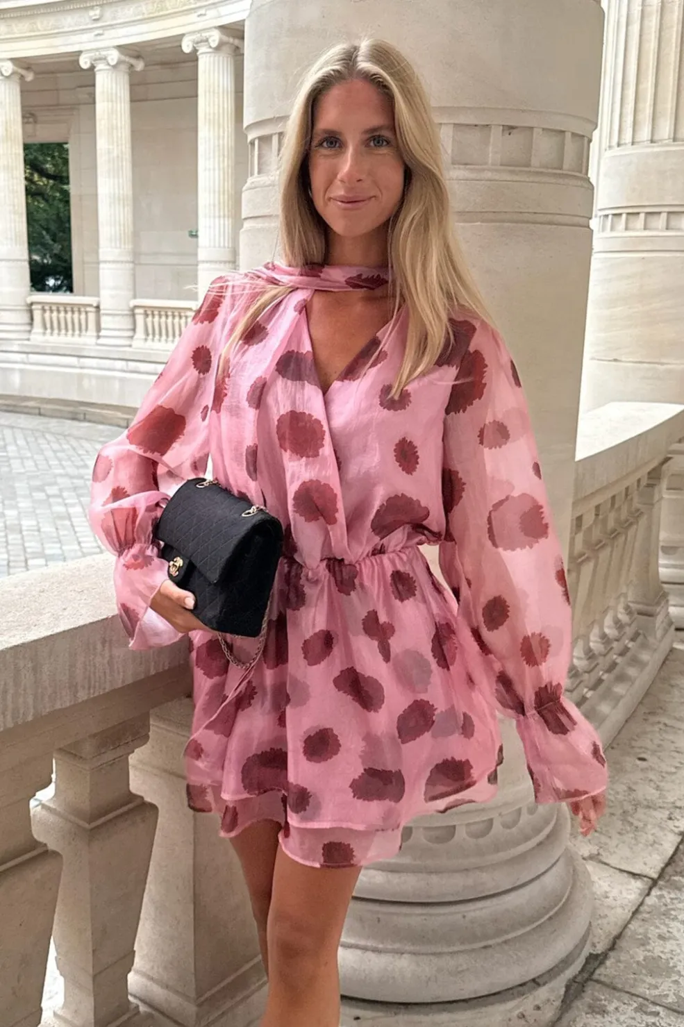 Kort kjole fra BYIC i lyserød med rødt blomsterprint. Kjolen har en løs pasform med to lag skørt og flæsedetaljer ved V-udskæringen. Et bindebånd ved halsen kan styles på forskellige måder.