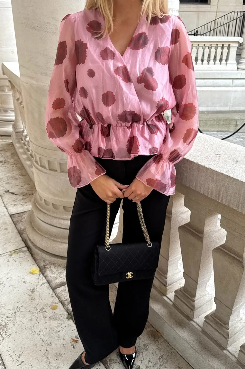 Skjorte fra BYIC i lyserød med rødt blomsterprint. Den har V-udskæring med flæsedetaljer og lange ærmer med elastiske manchetter. Skjorten har en løs pasform med markeret talje.