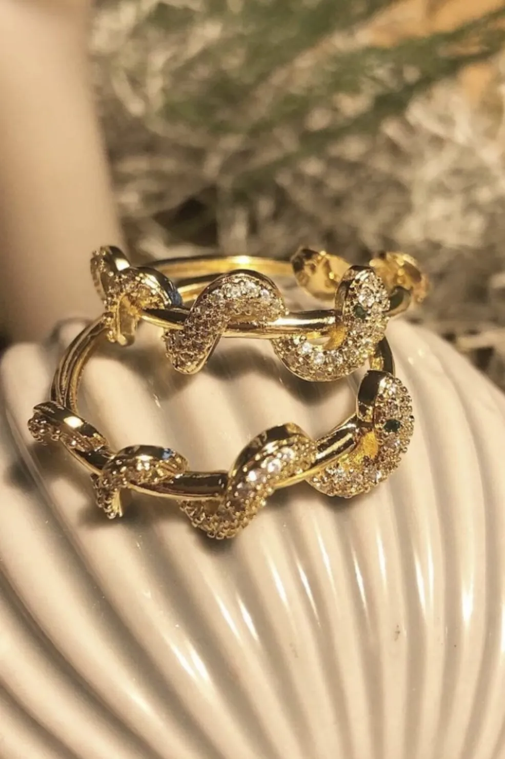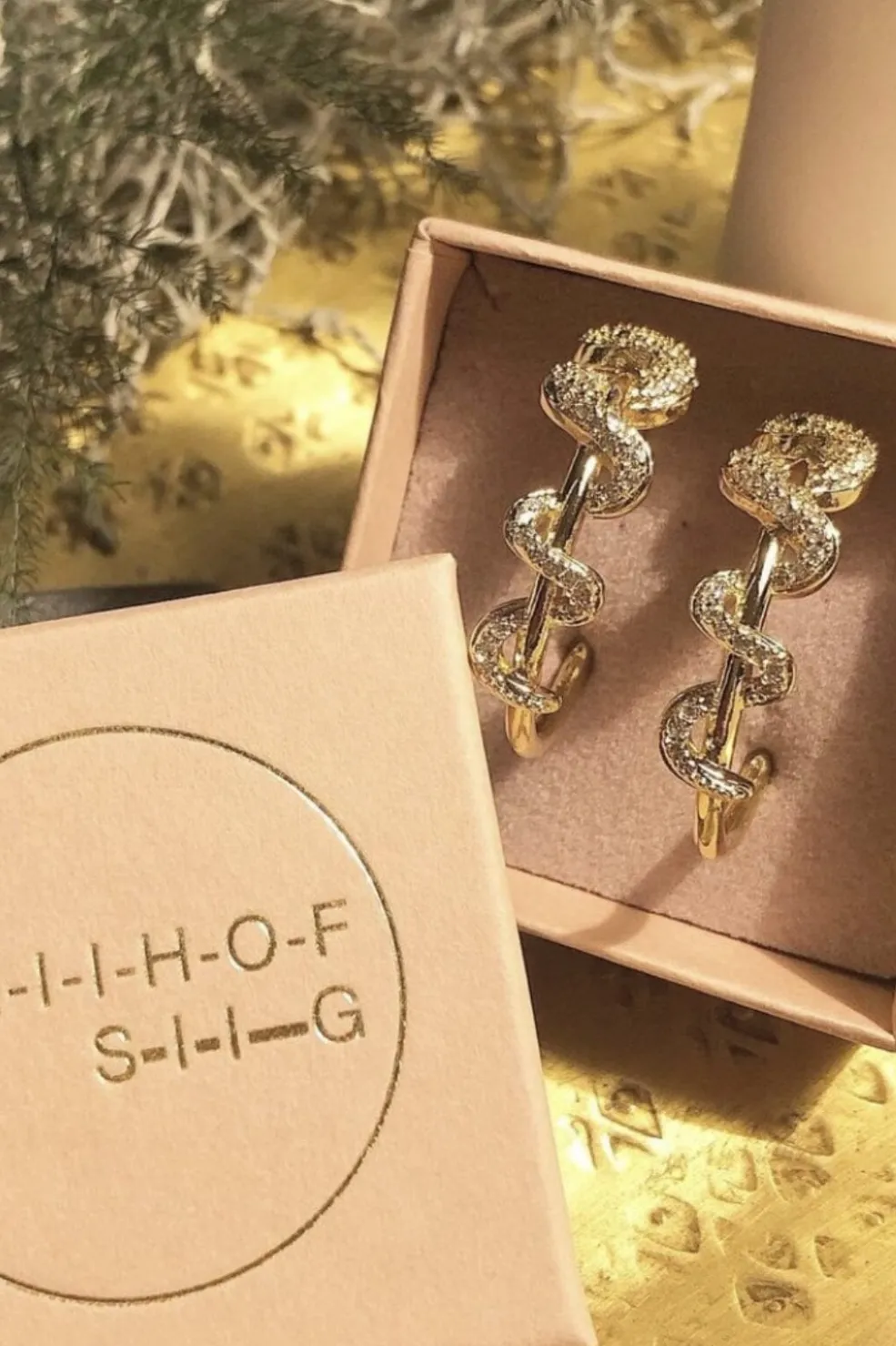 Øreringe i forgyldt messing med et bølget slangedesign. De har en blank overflade og sidder som stikøreringe med en fast lukning.