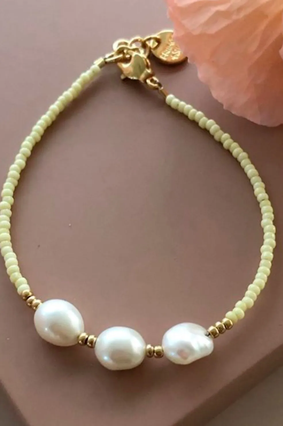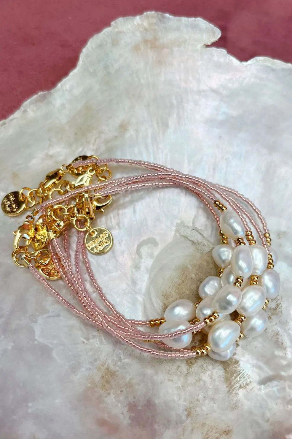 Smukt armbånd, fra FRIIHOF & SIIG med 3 ferskvansperler, farvede sten og forgyldte detaljer.