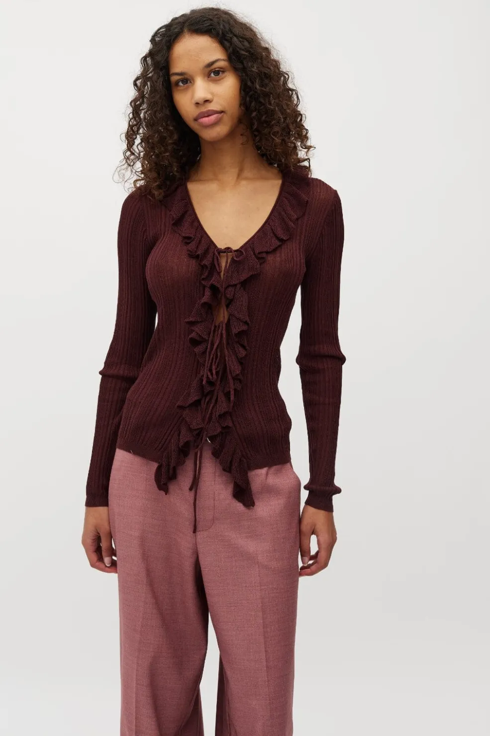 Brun striktrøje fra MbyM med flæser langs fronten og en ribbet struktur. Trøjen har lange ærmer, V-hals og snørelukning.