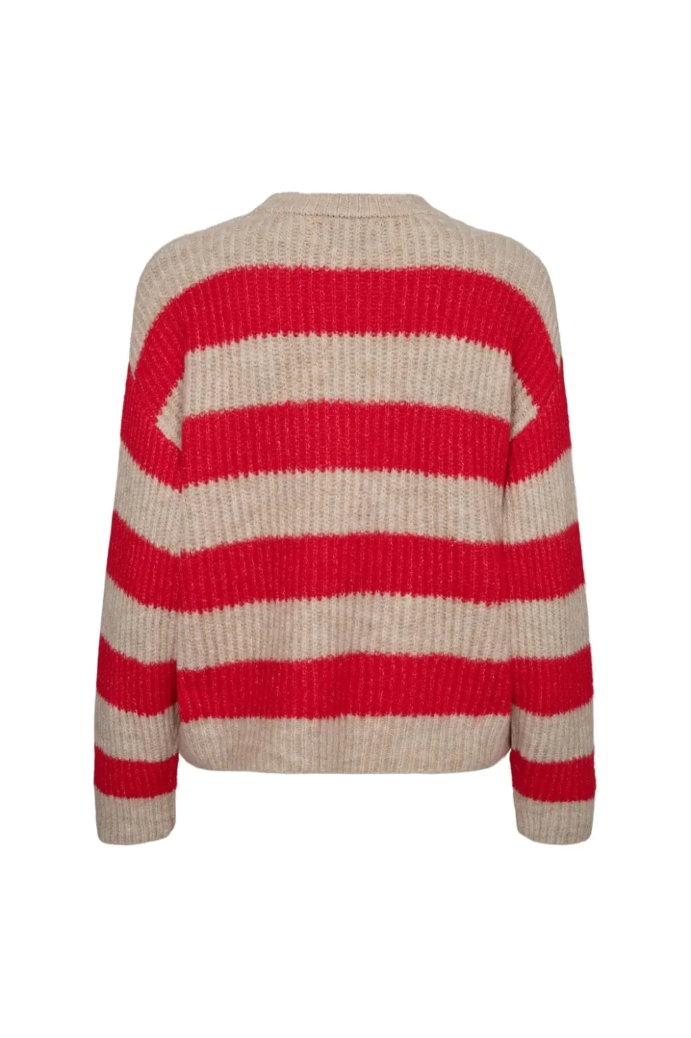 Stribet pullover fra Liberte med brede vandrette striber i rød og creme. Den har en ribbet tekstur og rund halsudskæring samt lange ærmer.