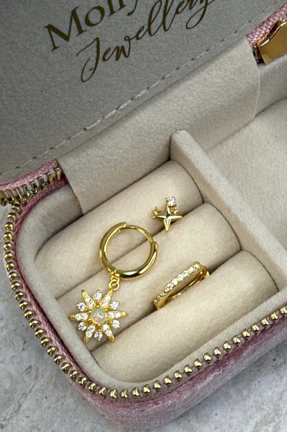 Øreringe fra Molly&My Jewellery med forgyldt finish. Sættet indeholder to par med stjerneformede vedhæng og indlagte sten.