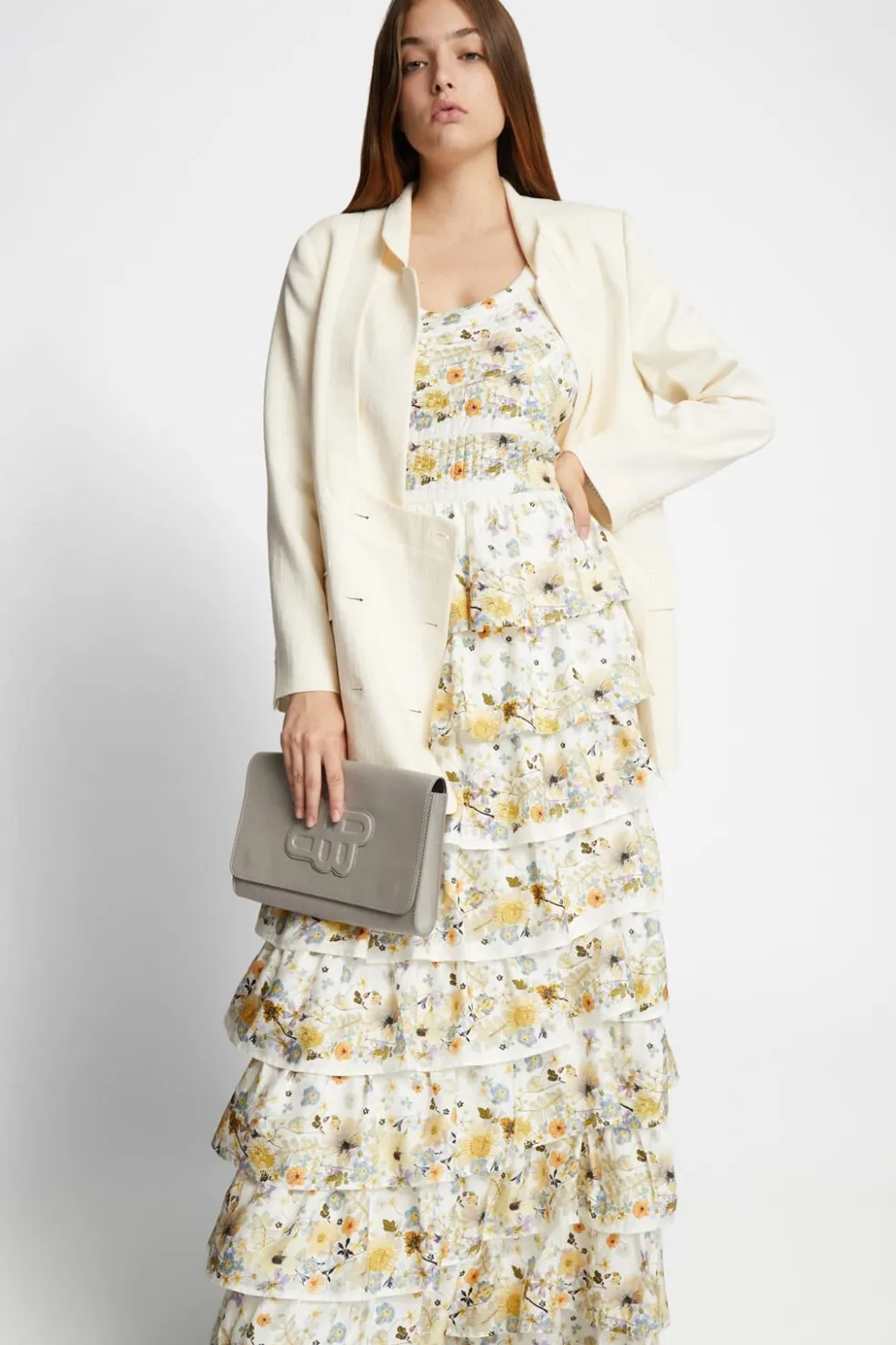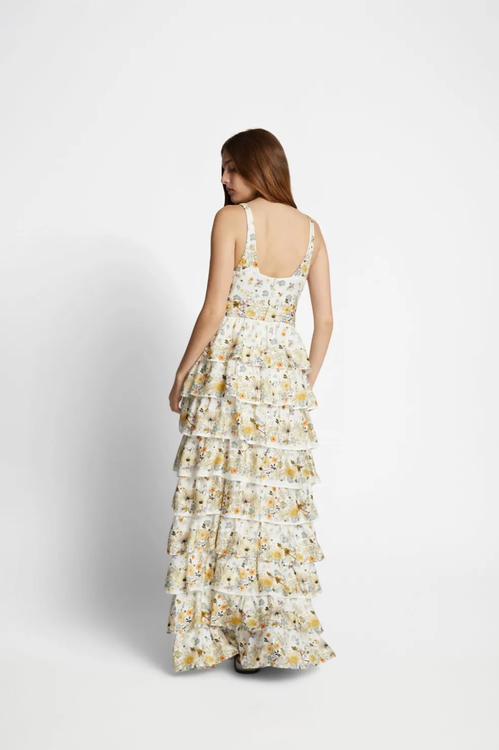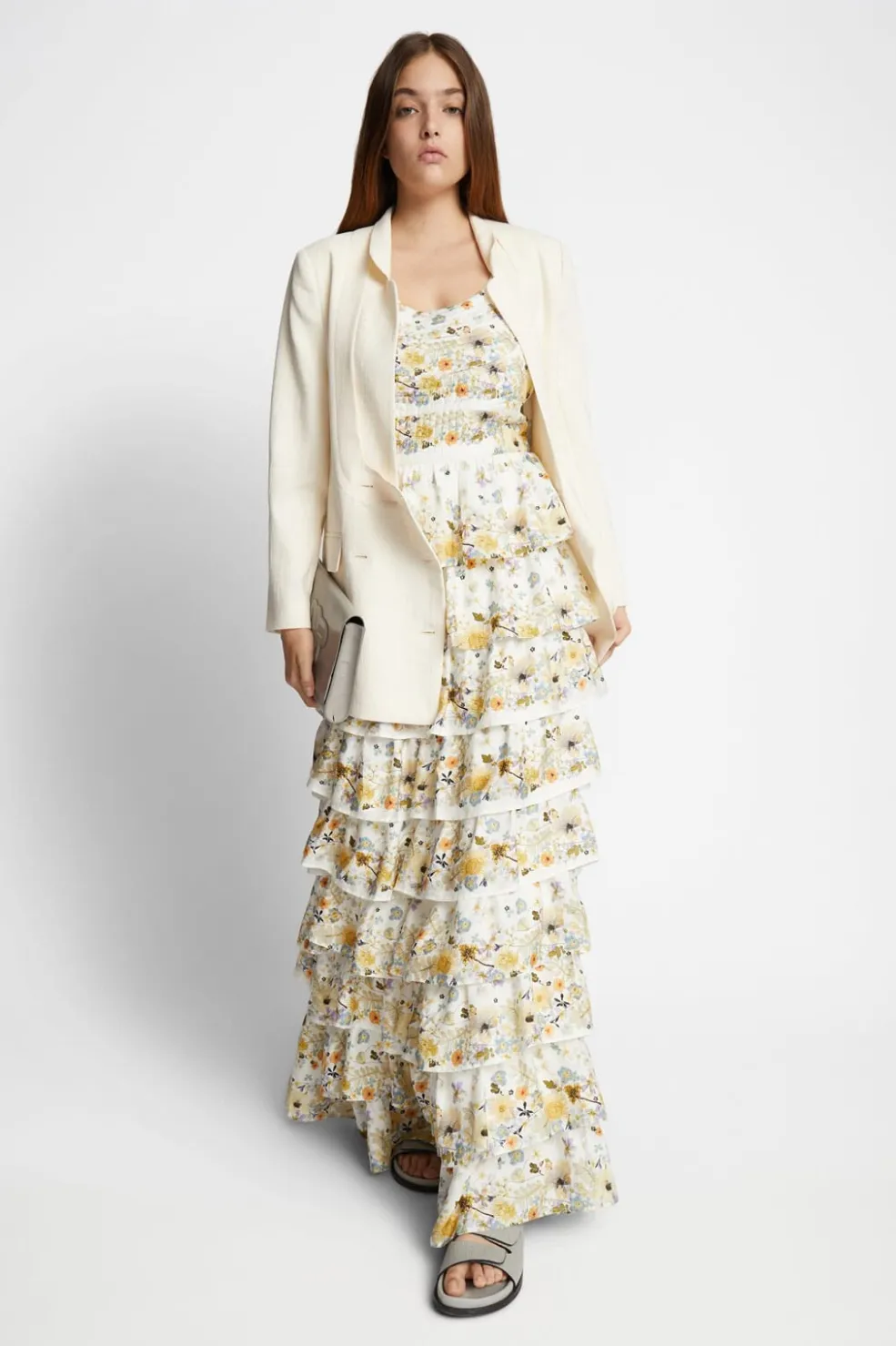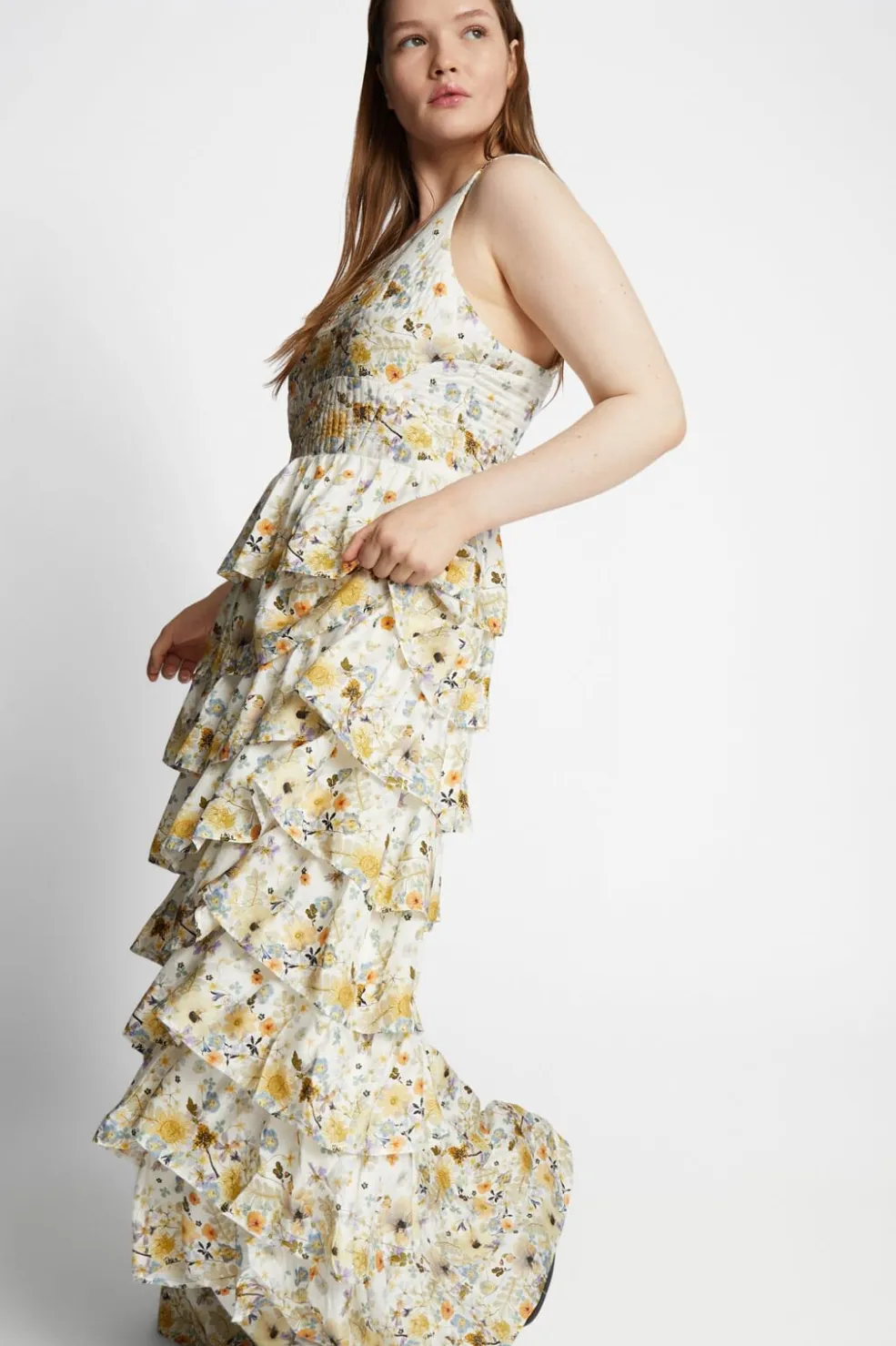 Lang kjole fra Munthe med blomsterprint i gule og blå nuancer på cremefarvet baggrund. Kjolen har smockede detaljer ved brystet og tynde stropper.