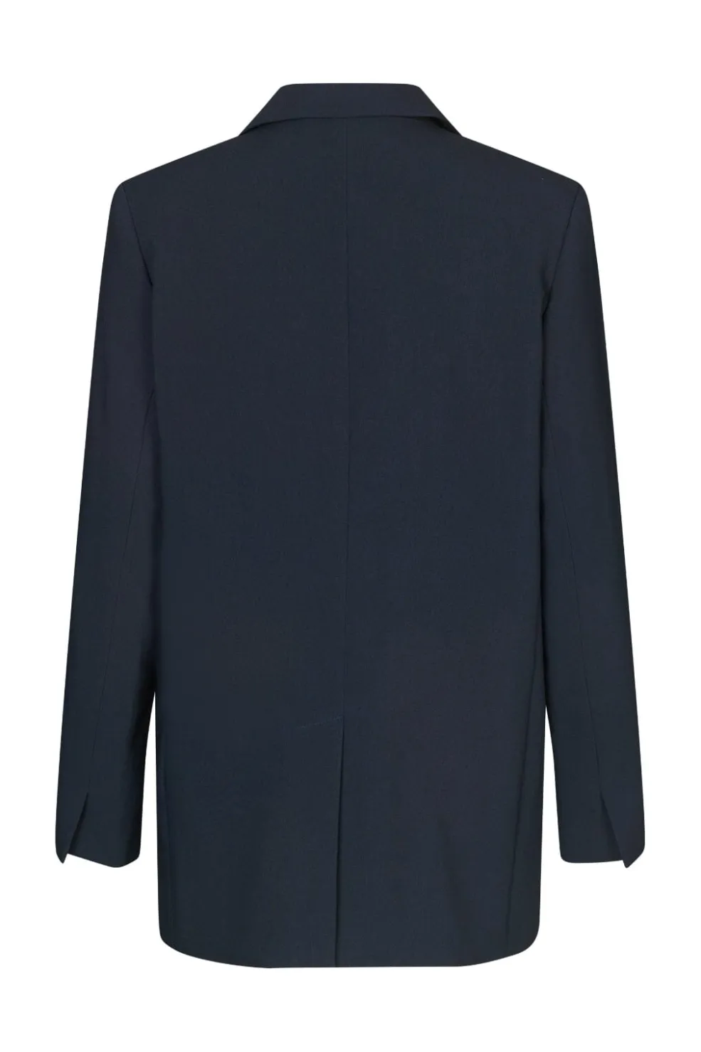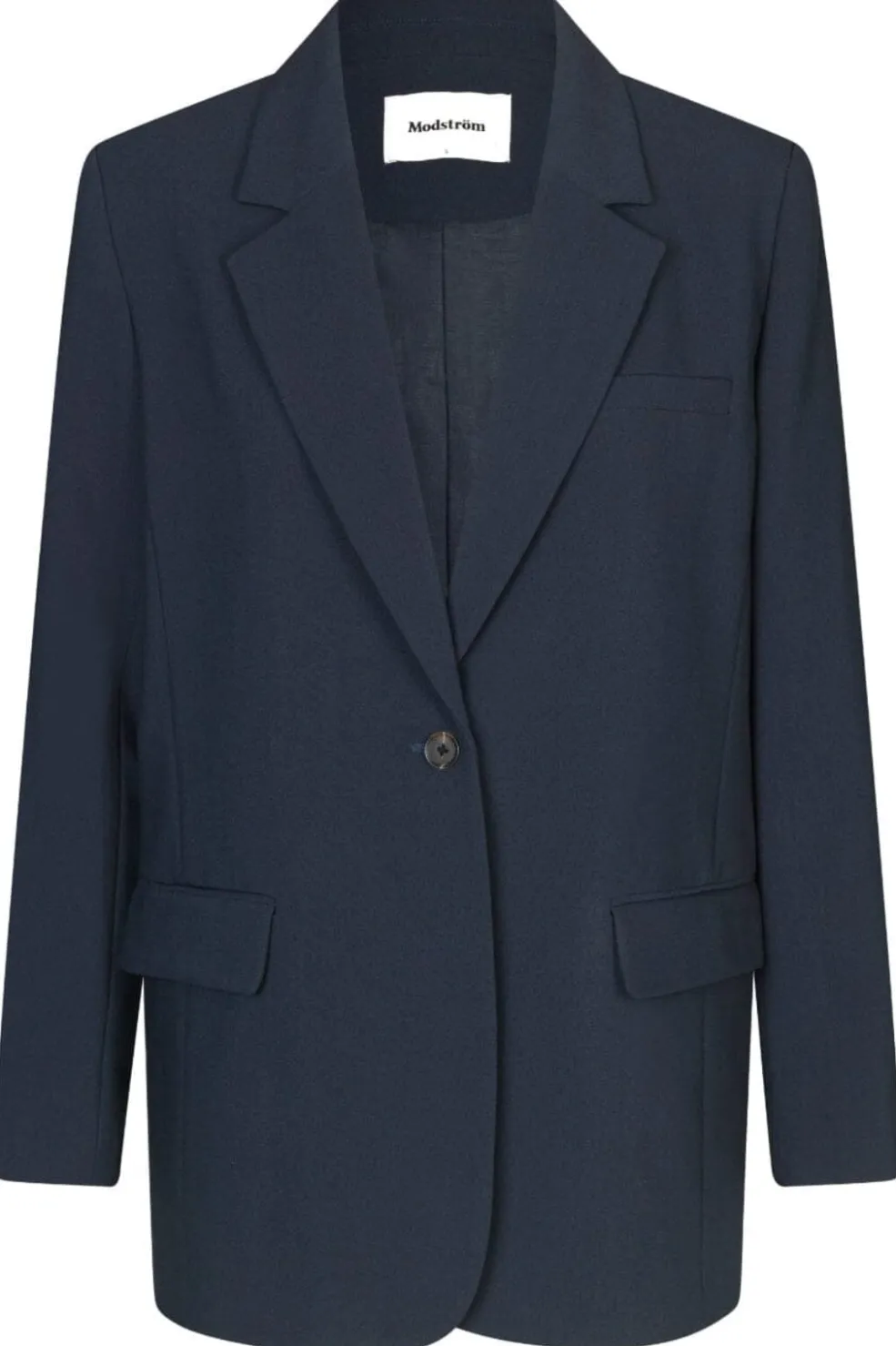 Mørkeblå blazer fra Modström med klassisk reverskrave. Blazeren har en brystlomme i venstre side og lukkes med knapper foran. Den lange pasform giver et rent og enkelt udtryk.
