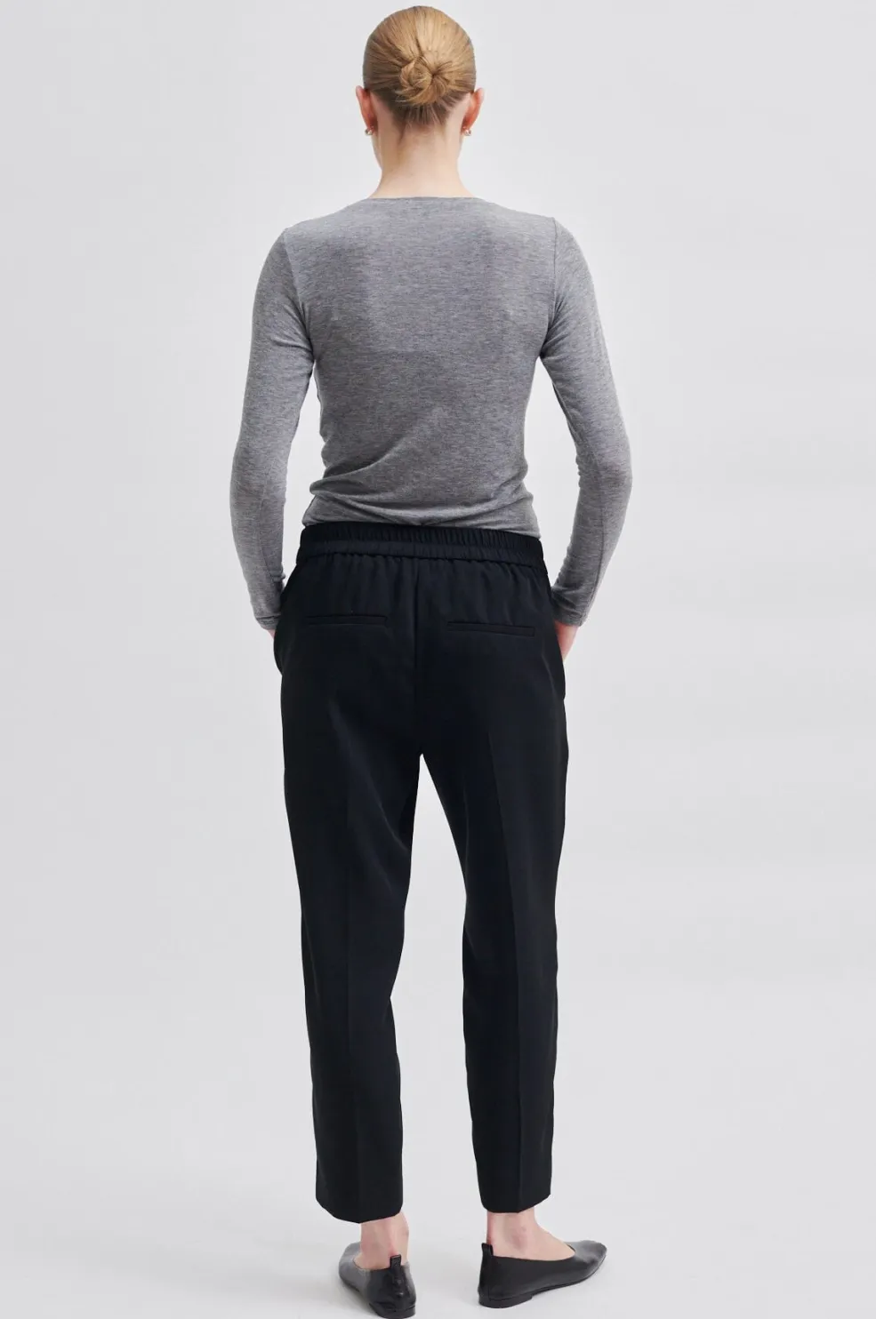 Sorte bukser fra Second Female i en halvblank polyesterkvalitet. Bukserne har lige ben med pressefolder og en bred linning med elastik bagpå.