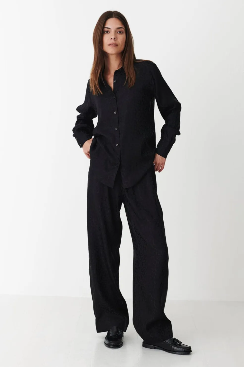 Sorte bukser fra Karmamia med diskret leopardmønster. Bukserne har en løs pasform og er lavet af en blanding af silke og viskose med et blødt fald.