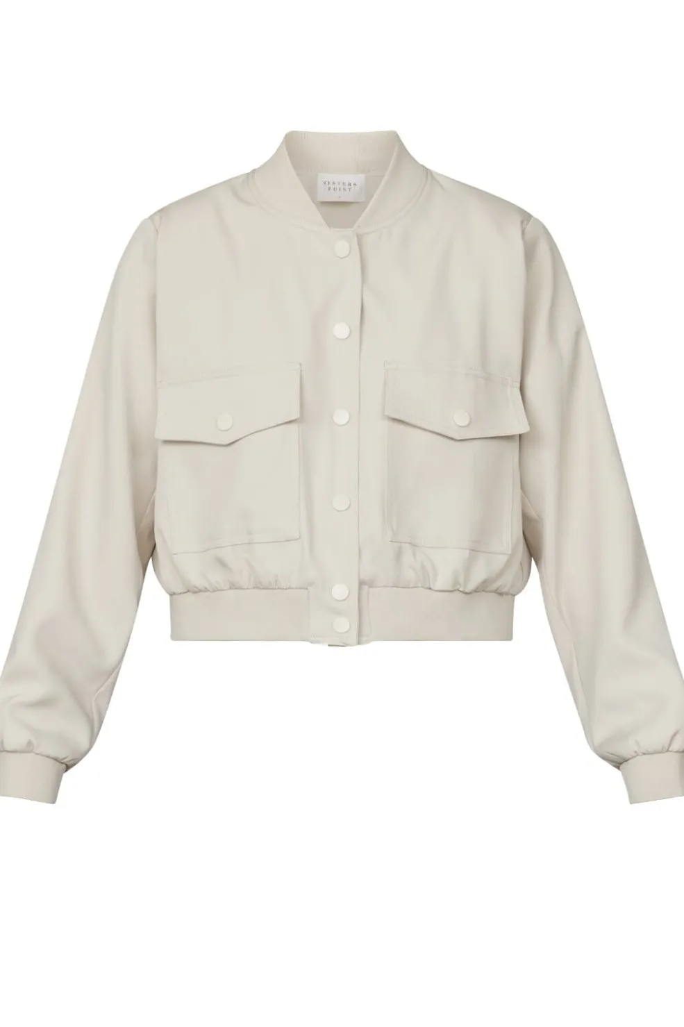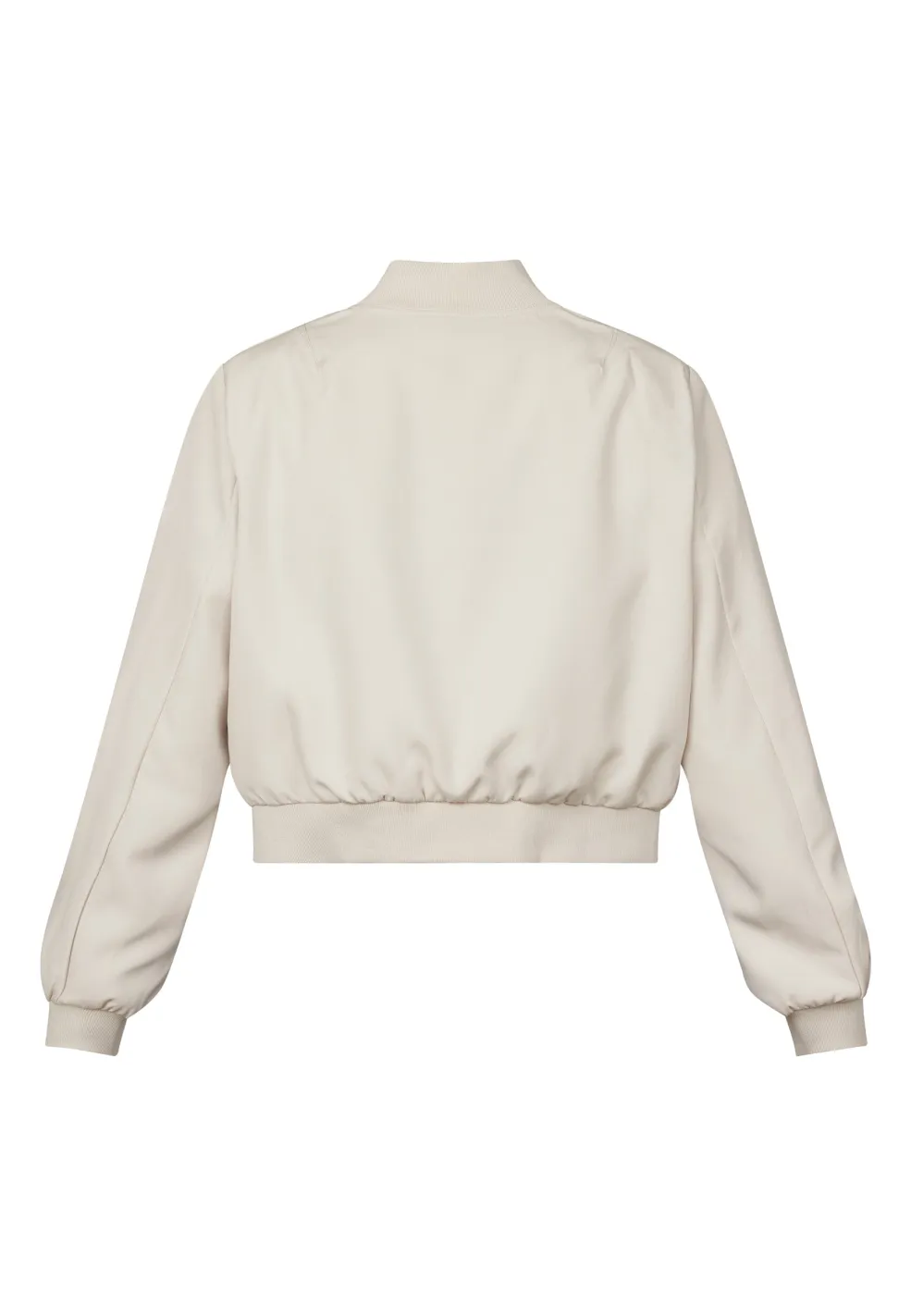 Beige bomberjakke med knaplukning foran. Jakken har en rund hals og brede ribkanter ved talje og nakke. De to forlommer og dekorative syninger giver jakken et sporty udtryk.
