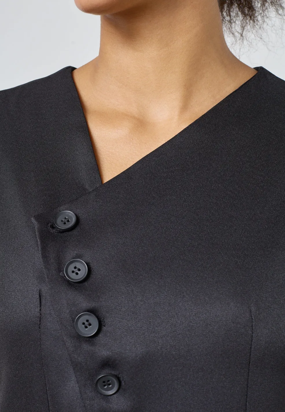 Sort vest fra Sisters Point med asymmetrisk knaplukning langs fronten. Vesten har en V-hals og et ærmeløst design med to dekorative lommer.