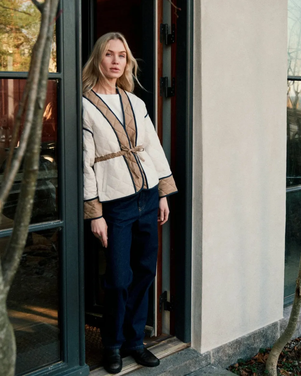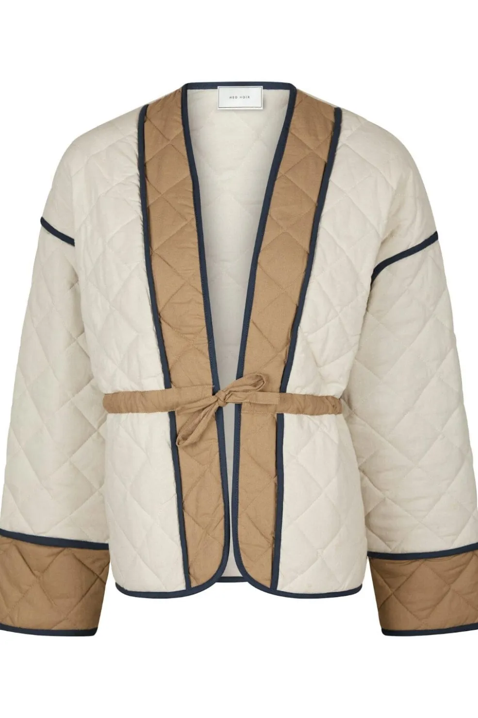Quiltet jakke fra Neo Noir i cremefarvet bomuld. Den har V-udskæring, lange ærmer og en kombination af quiltet stof og kontrastfarvet kant med snøredetalje i taljen.