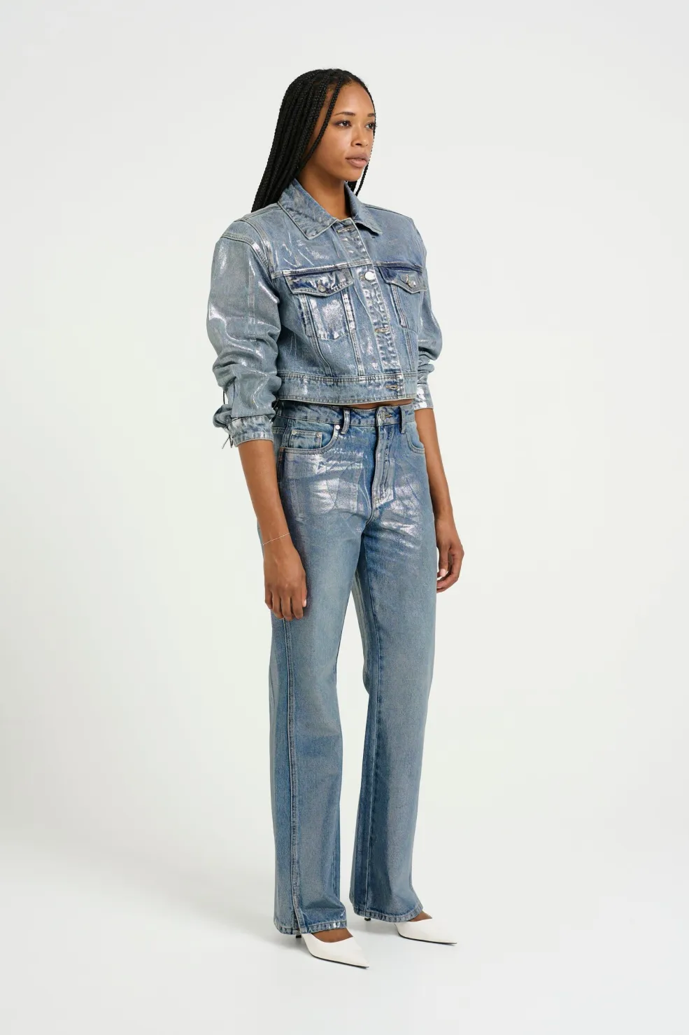 Lige jeans fra Gestuz med en blank, sølvblå coating. Den belagte overflade giver et skinnende udtryk, og bukserne har et lige snit i fuld længde.