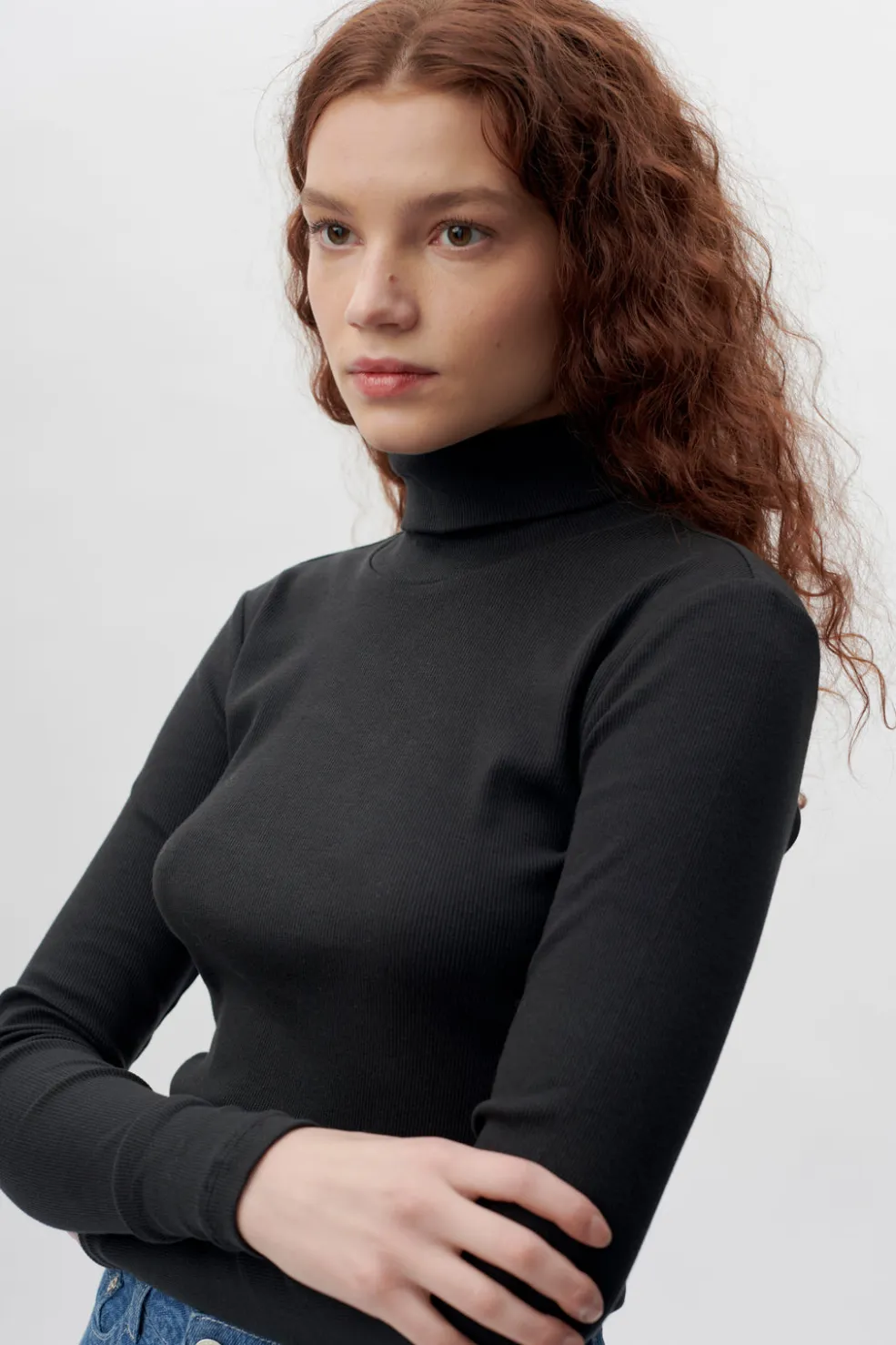 Sort rullekravebluse fra Gestuz med ribbet struktur. Denne bluse har en høj krave og lange ærmer, der giver et klassisk og praktisk design til både hverdag og fest.